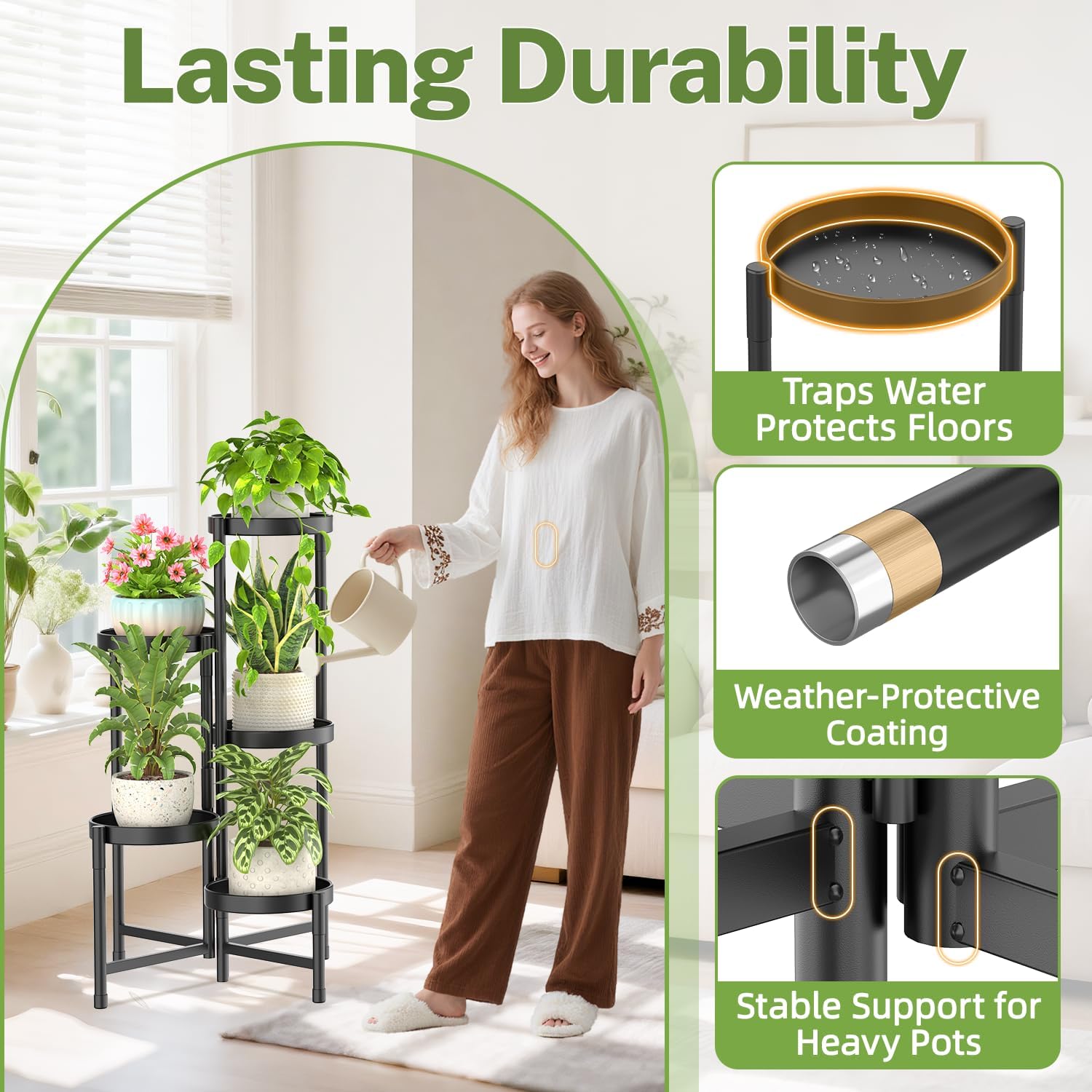 - Stable Triangular Support Legs: The metal plant stand is designed with a center pole that does not touch the floor, while outer legs form a stable triangular structure. Each ground-touching leg comes with protective caps to prevent scratches on floors