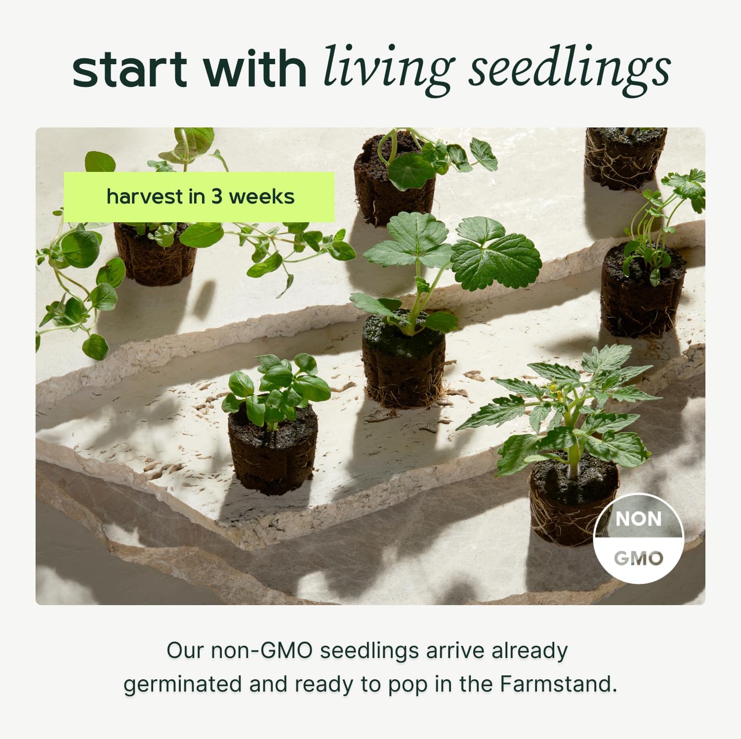 - 24 SEEDLING CREDITS: This starter kit includes a unique QR code on your Farmstand packing slip with instructions to redeem 24 seedlings from our website. Your special seedling bundle includes the best veggies, leafy greens, herbs, fruits and lettuce of the season. These pesticide free, non-GMO, pre-grown plants will have you harvesting 3 weeks early and help ensure your success. Seedlings not shippable to U.S. outlying territories.