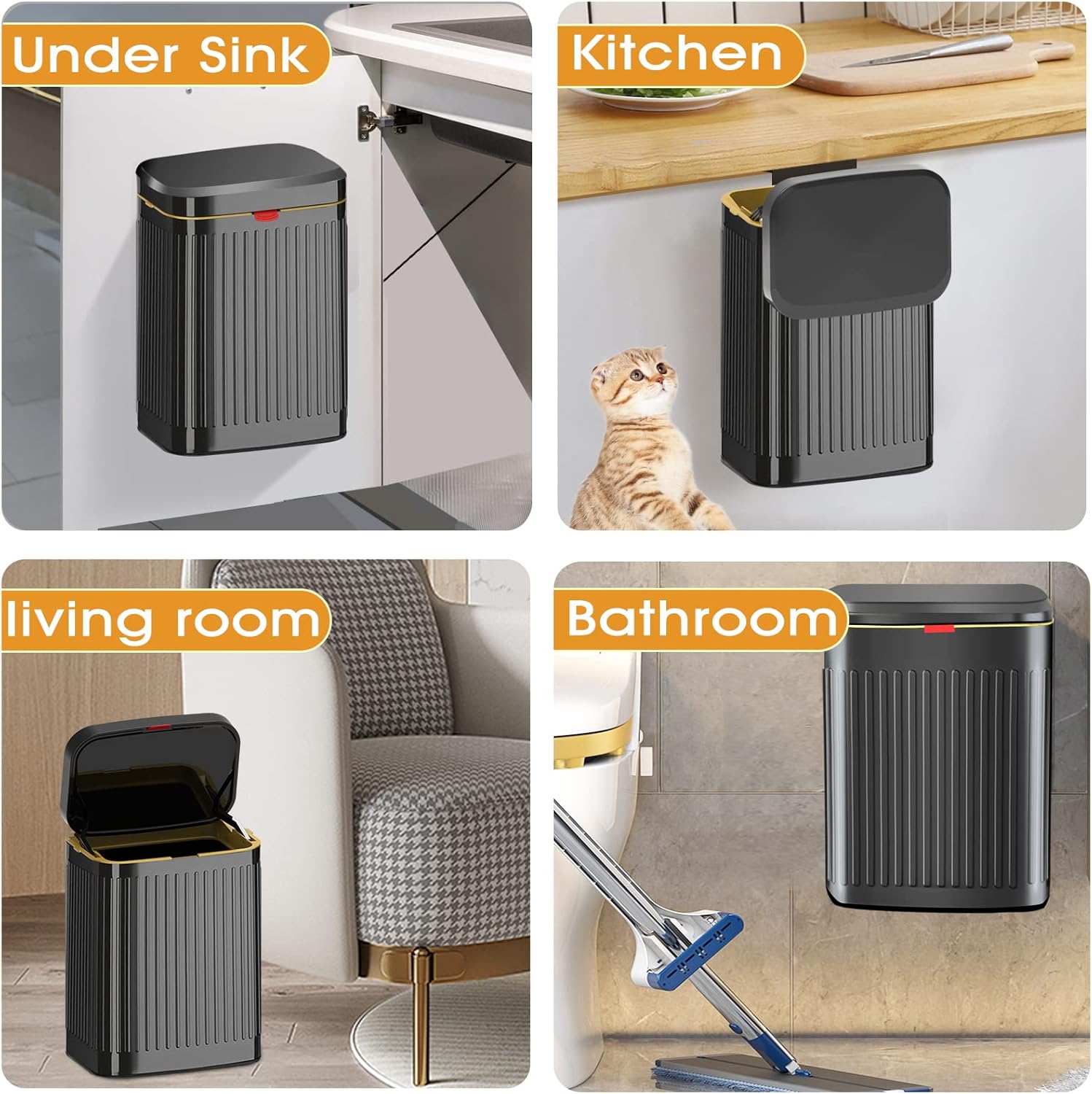 - Suitable for Various Space: Dimension: 8.66 * 5.9 * 12.2in. Capacity: 8L/2.11 Gal. The sleek and elegant design for garbage can makes it a great addition to your home decor, while the secure lid ensures that cats or dogs won't make a mess. Perfect fit in your kitchen, bathroom, bedroom, office, or even in your college dorm.