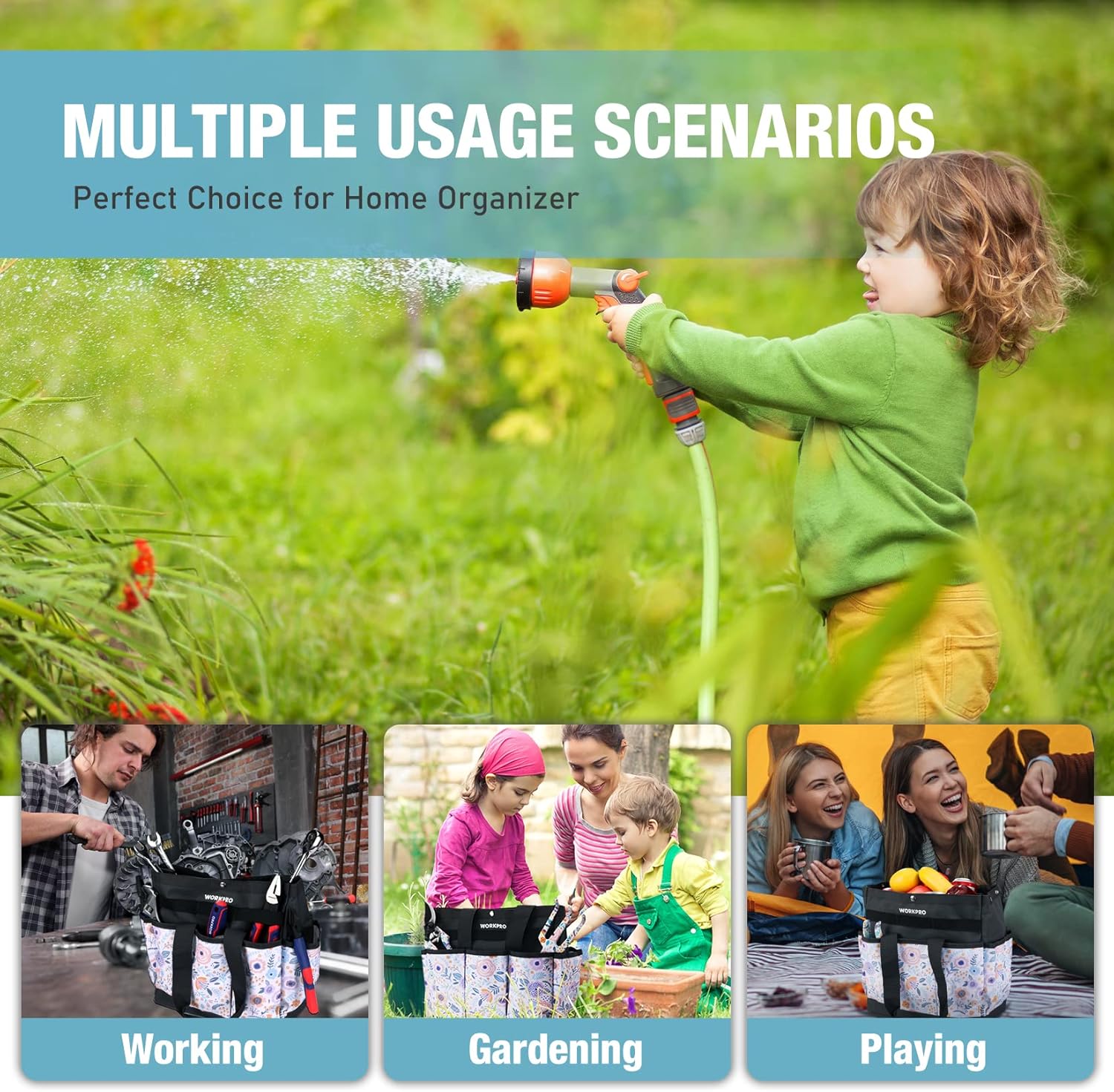WORKPRO Garden Tool Bag, 9 Pockets Gardening Bag, Heavy Duty Oxford Garden Tote Caddy (Tools NOT Included), 12" x 12" x 6" (Floral White)