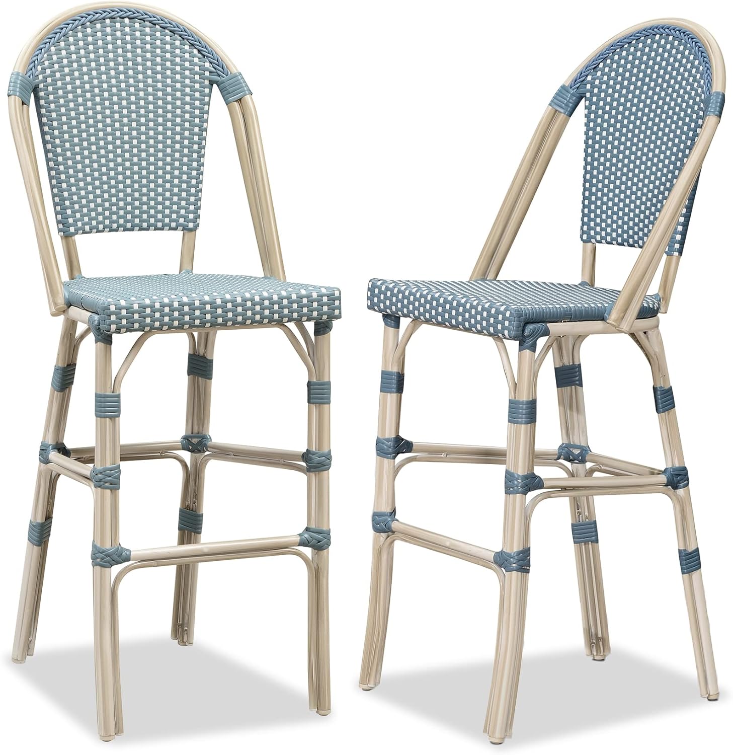 PURPLE LEAF French Bar Stool Set of 2 White Print Finish Patio Bar Stools with Back Rattan Chairs Wicker Bar Height Stool 30" with Footrest Kitchen Island Stools Outdoor Barstool Light Blue