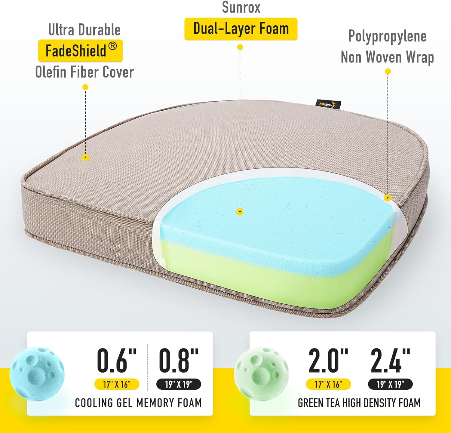SUNROX Gel Memory Foam Chair Cushions, FadeShield Water-, Stain-Resistant Durable Reversible Seat Cushion Pads with Ties for Indoor/Outdoor Kitchen Dining Office 17"x16" Set of 4, Husk Birch