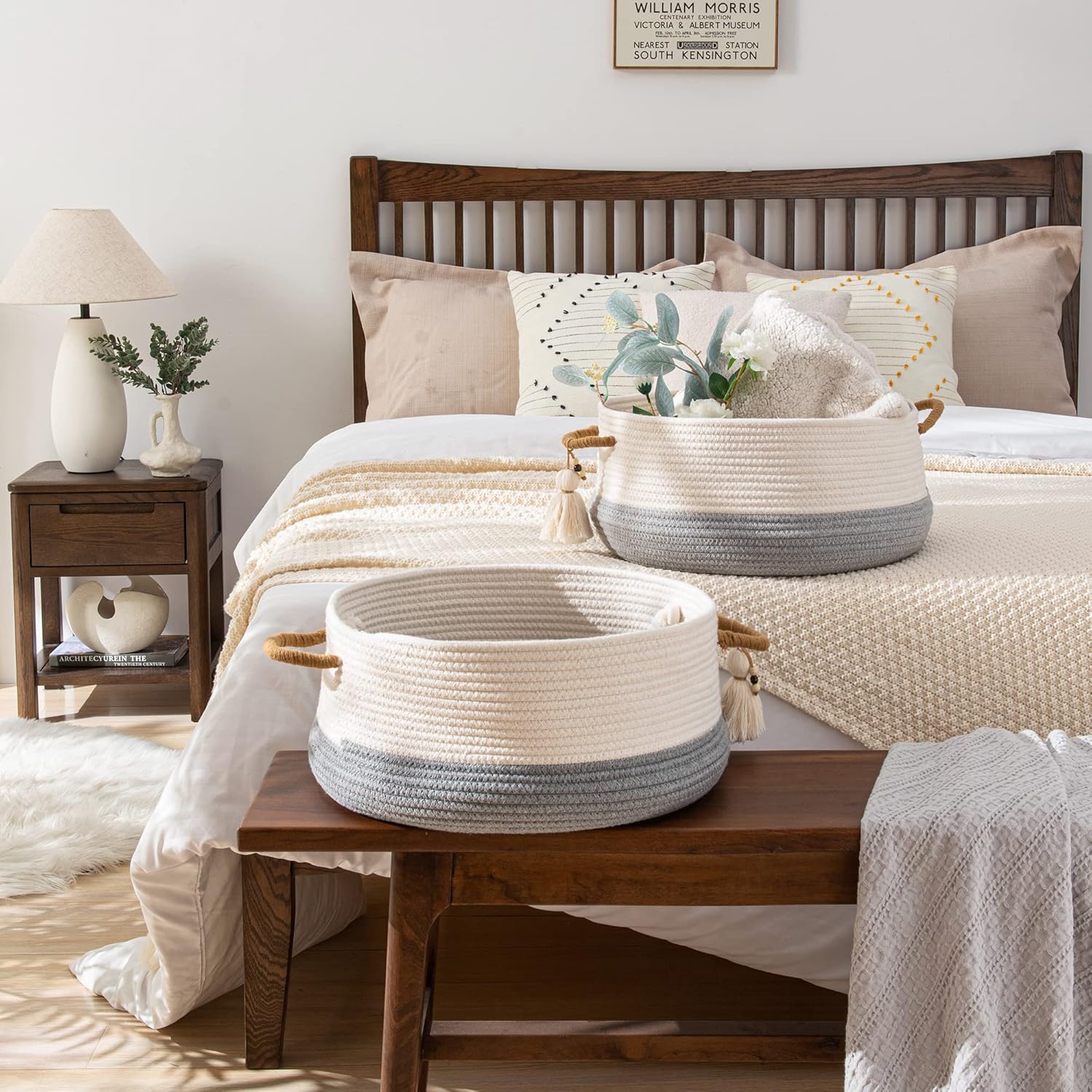 KAKAMAY Woven Baskets for Storage(16"x8"),Blanket Basket for Organizing Living Room,Cotton Rope Basket Woven Baby Laundry Hamper,Collapsible Laundry Room Organization,Clothes,Toy Chest(Grey)