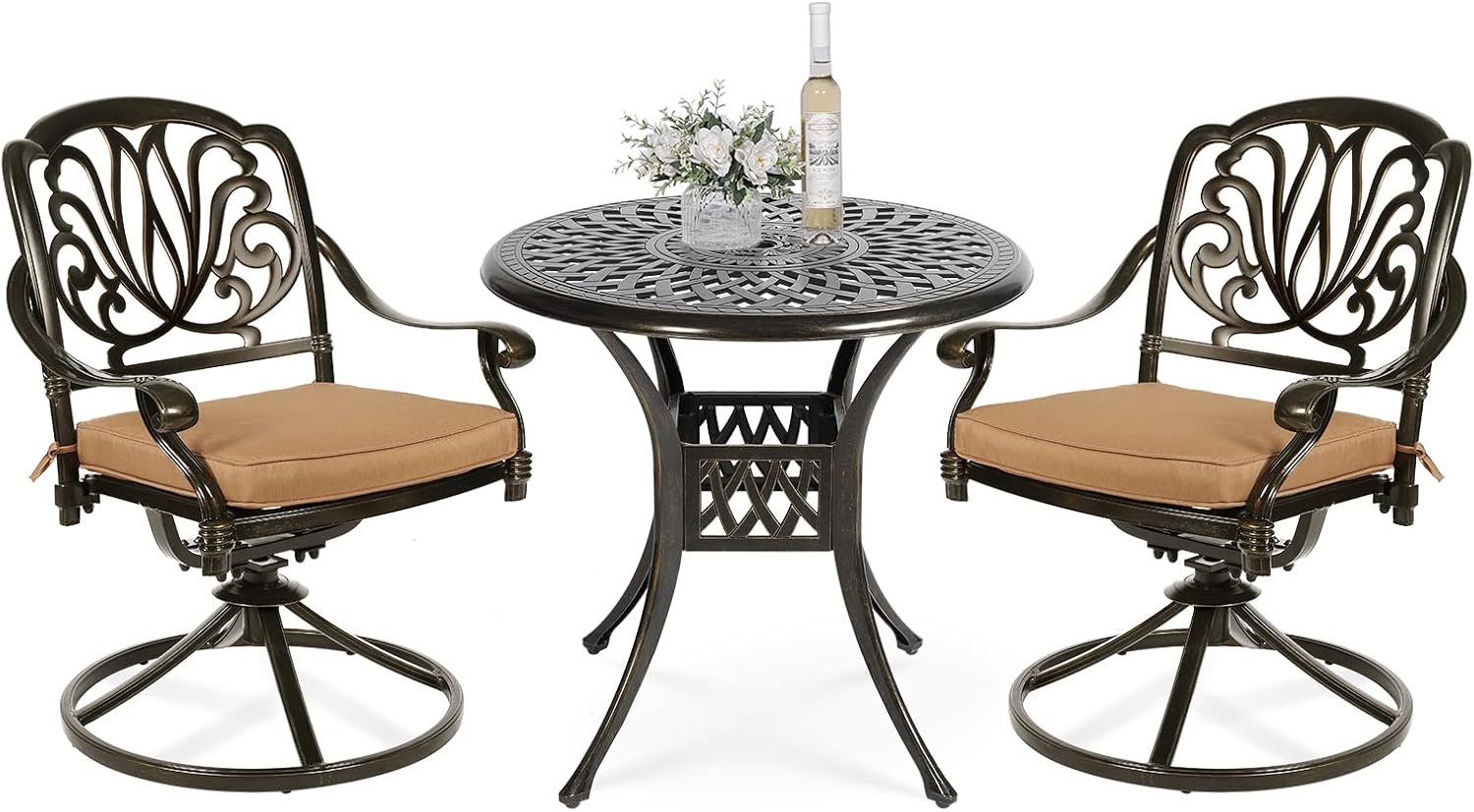 - 【STYLISH APPEARANCE】 - This 3-Piece Dining Set includes 2 swivel dining chairs and 31" round cast table. Elegant cast accents scroll across the chairs and table top, adding a level of sophistication and craftsmanship to the collection. Perfect addition to your patio, yard, deck, or porch.