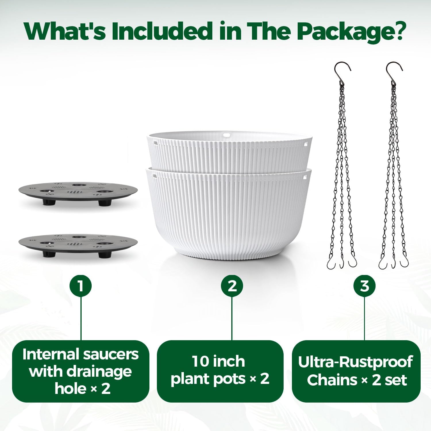 - 2 in 1 Planter pot: Our 10 inch white hanging flower pots can be hung or placed. Installing the chain plant hanger to the hanging baskets is very simple. They can also easily be removed if you want pull the plant down for pruning or decorate tables