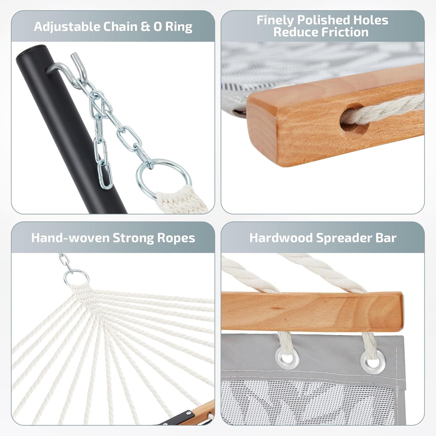 - 【Curved Spreader Bar】The angle of the curved bars make the center of gravity more stable when using. The countersunk spreader bar holes can reduce the friction between rope and wood which make the hammock stands the test of time.