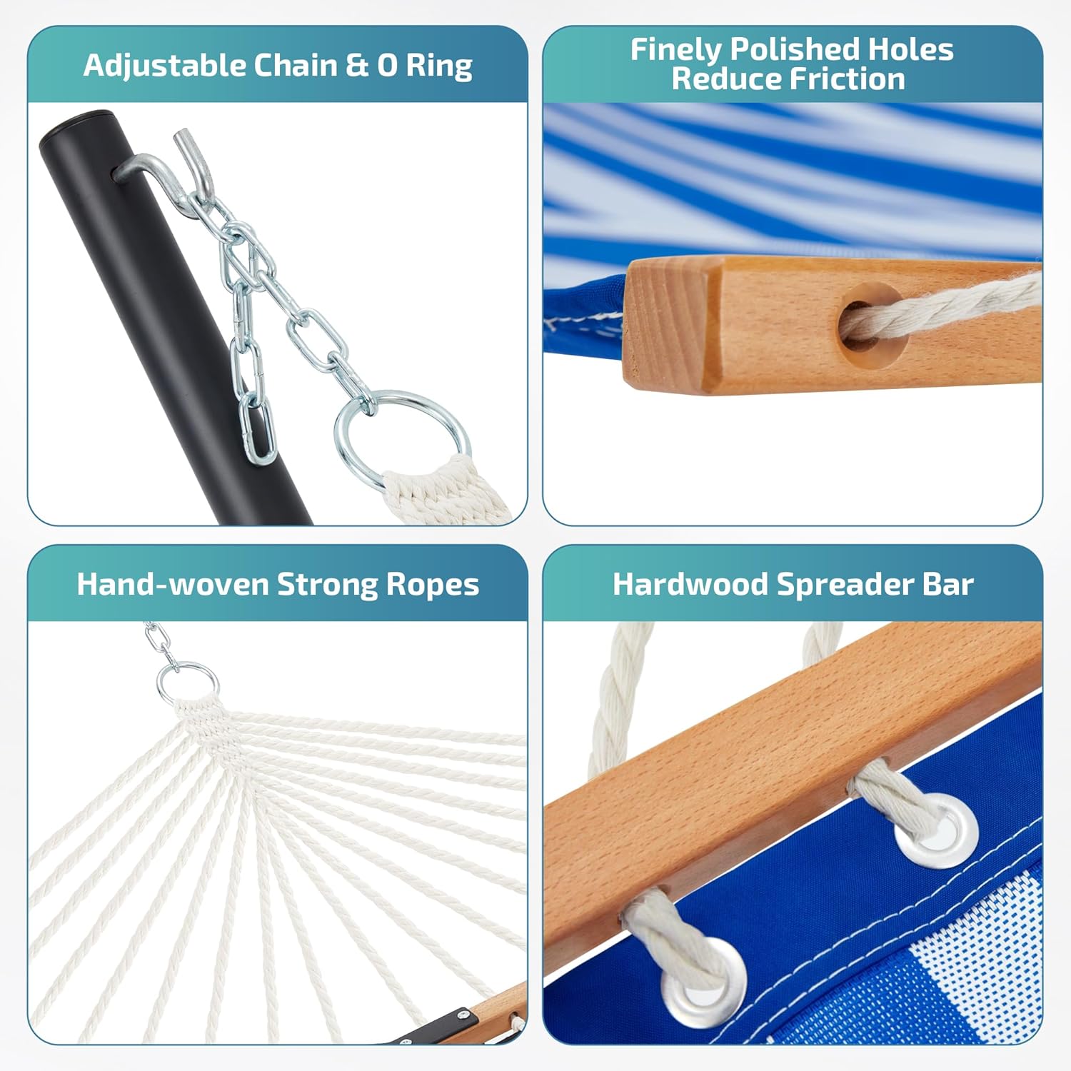 Two Person Hammock with Stand Heavy Duty, Outdoor Patio Hammock with Portable Steel Stand, Large Double Hammocks with Quick Dry Textilene Fabric,480lbs Capacity.(Blue White)