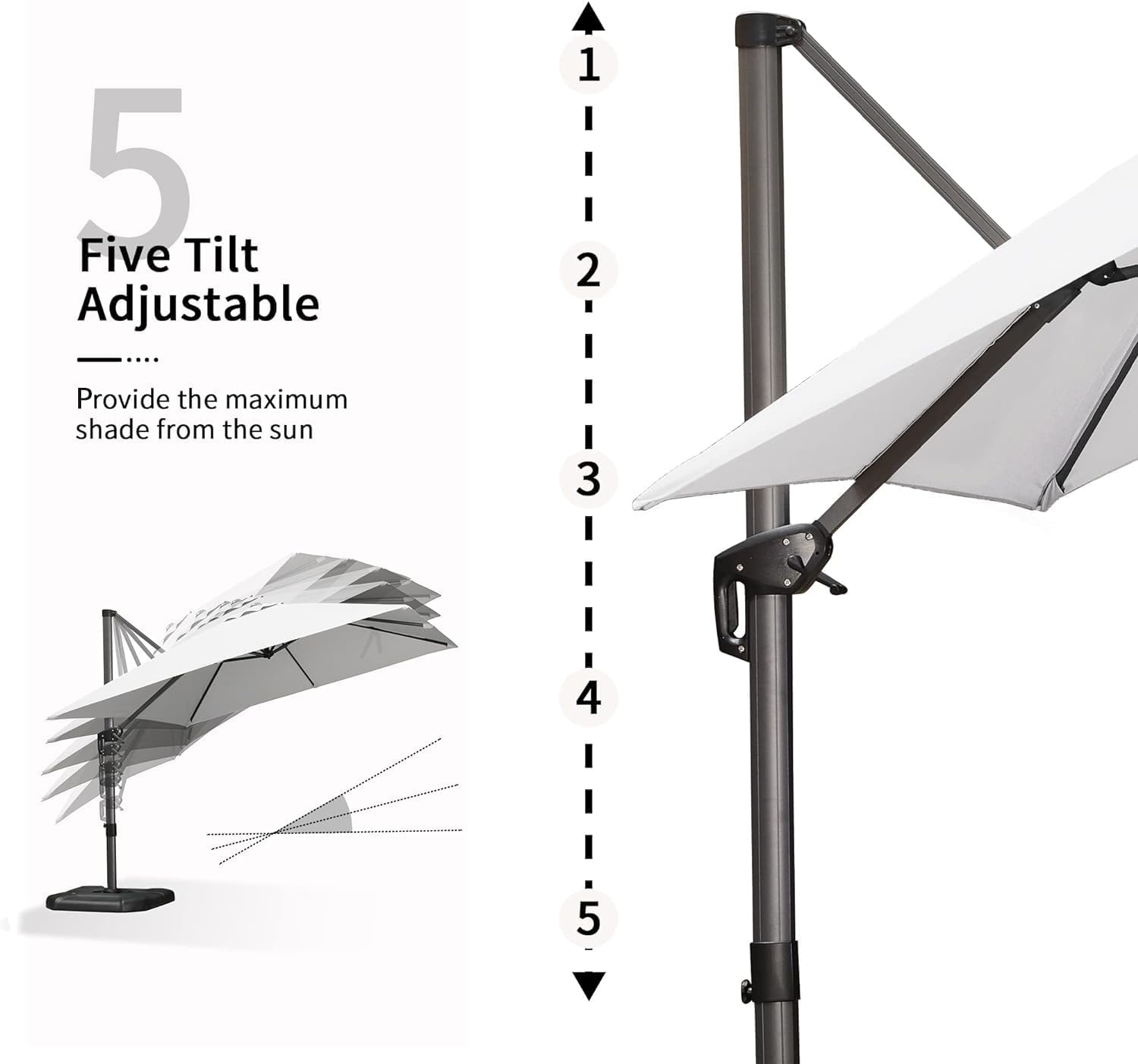 - The crank system of this cantilever umbrella makes it easy to raise and lower the canopy, the unique handle design also makes tilting the umbrella effortless, foot pedal allows for complete 360 degree rotation
