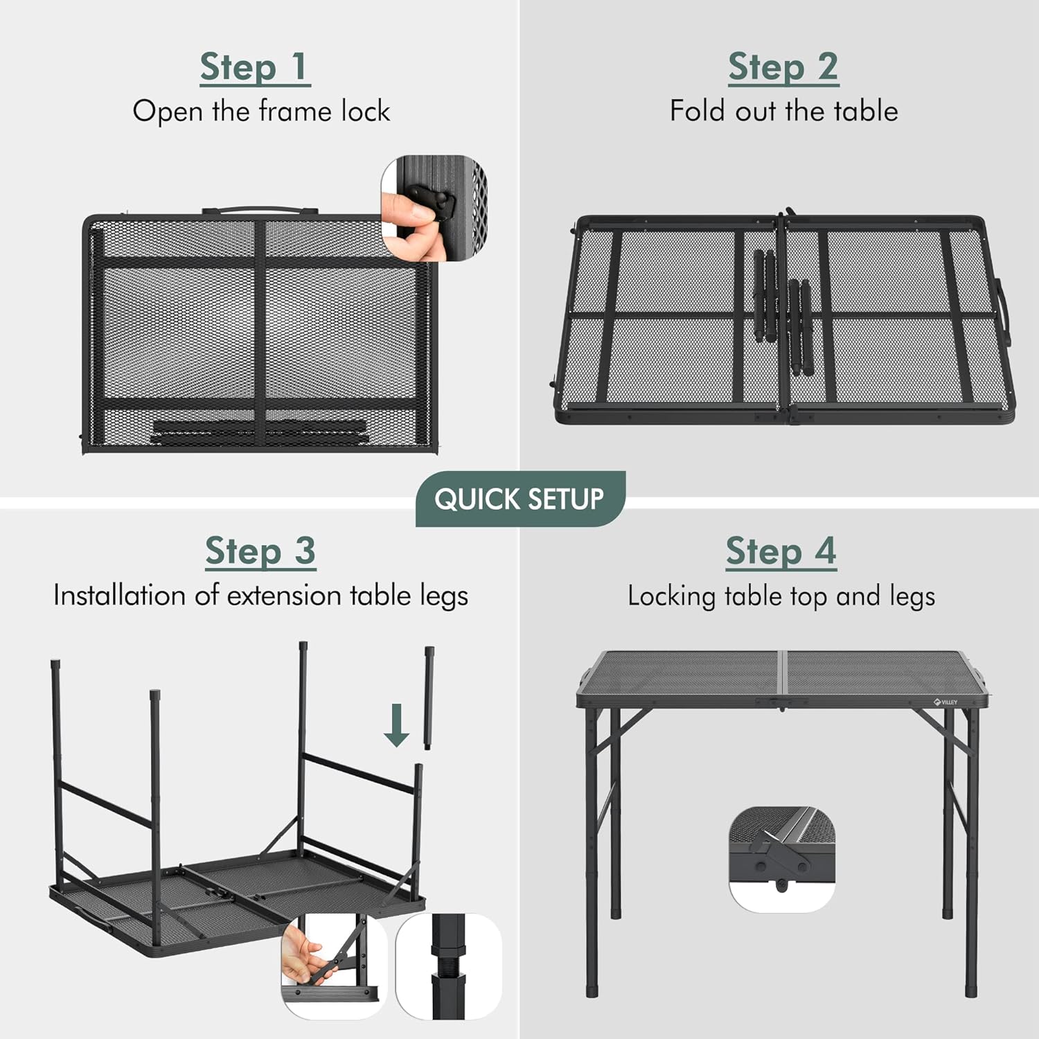 - Adjustable Height: With removable legs, the VILLEY adjustable camping table can be set to two heights (16" or 25") for both dining and preparation, adding convenience for outdoor activities like beach picnics