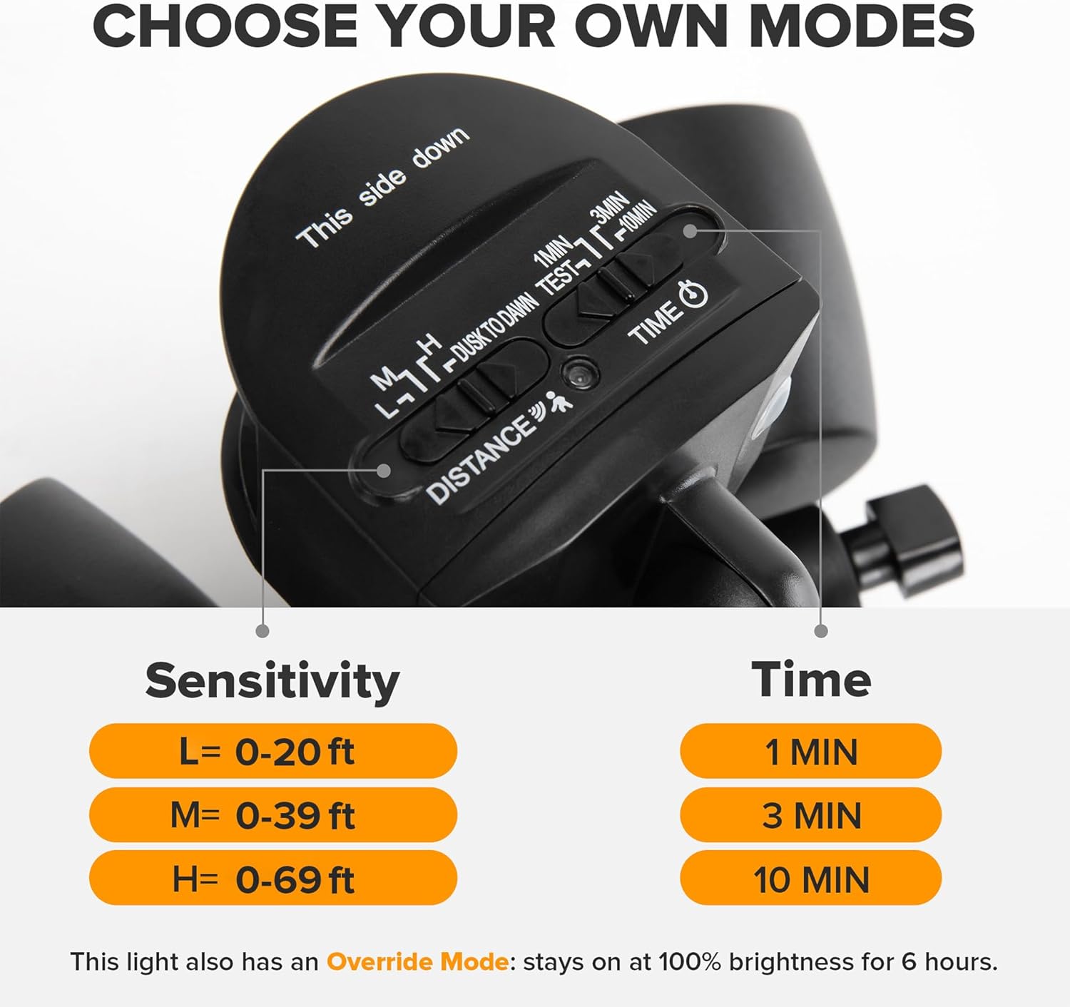 - 4 Lighting Modes: Test Mode, Security Mode, Dusk to Dawn Mode and Manual Override Mode. Manual override mode allows light to operate constantly for selected period of time. More choices can meet different demand for each customer. Choose the most appropriate mode for your needs and desires
