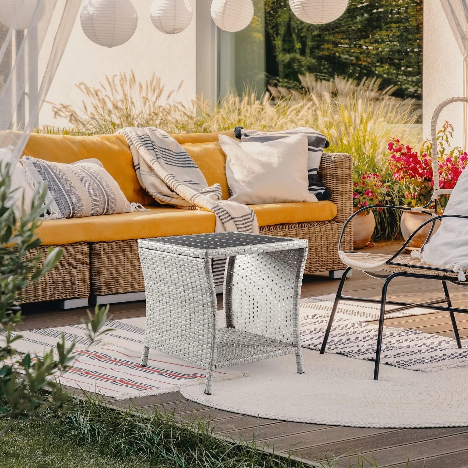 - 【Classic Two Tiers Double Storage Design】Rattan patio side coffee table with storage features a useful double storage design, the design of 2-tier makes the table have more space than ordinary side tables, upper poly lumber top could store items such as snacks, drink coasters etc, lower shelf at the bottom provides additional storage space for sundries or magazines for your convenience, perfect for outdoor living space, such as garden, deck, backyard, poolside