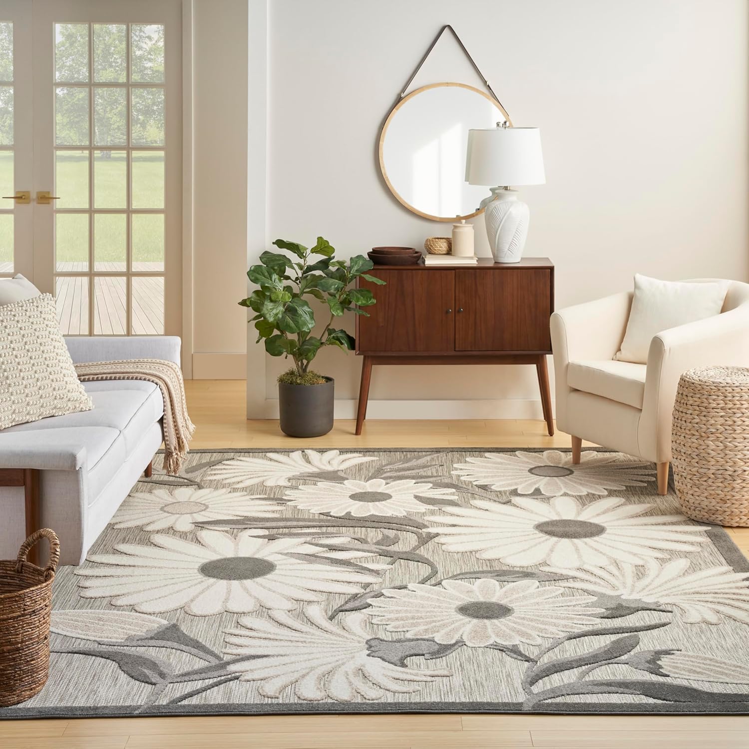 - EYE-CATCHING PATTERN: This floral outdoor rug is flatwoven with a subtly raised cut pile for a distinctive look and soft texture