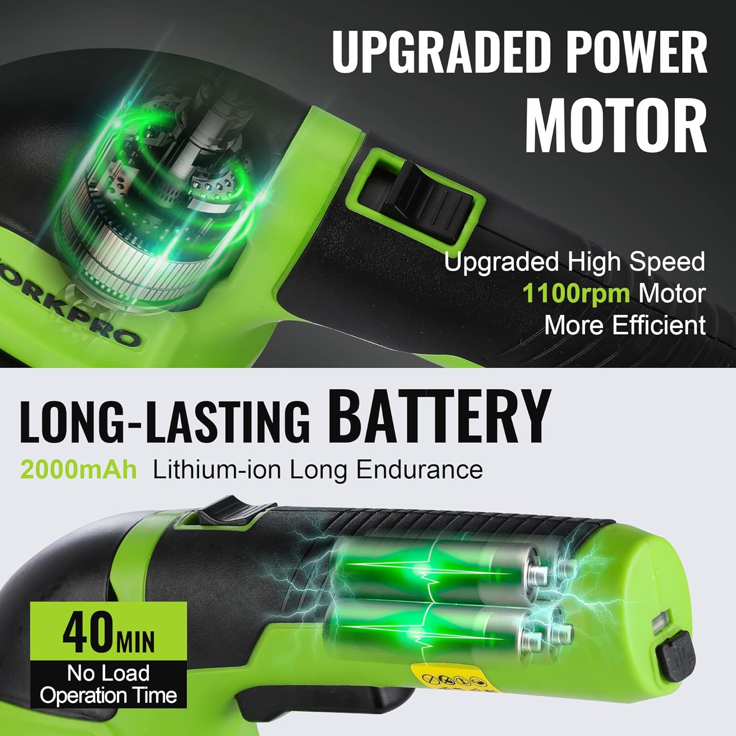 - Upgrade Power Motor: WORKPRO cordless grass trimmer has been upgraded with a powerful motor, and the 2-in-1 design makes switching from mowing to hedges quick and easy. Even if you are a beginner, this hedge trimmer has everything you need for your pruning needs