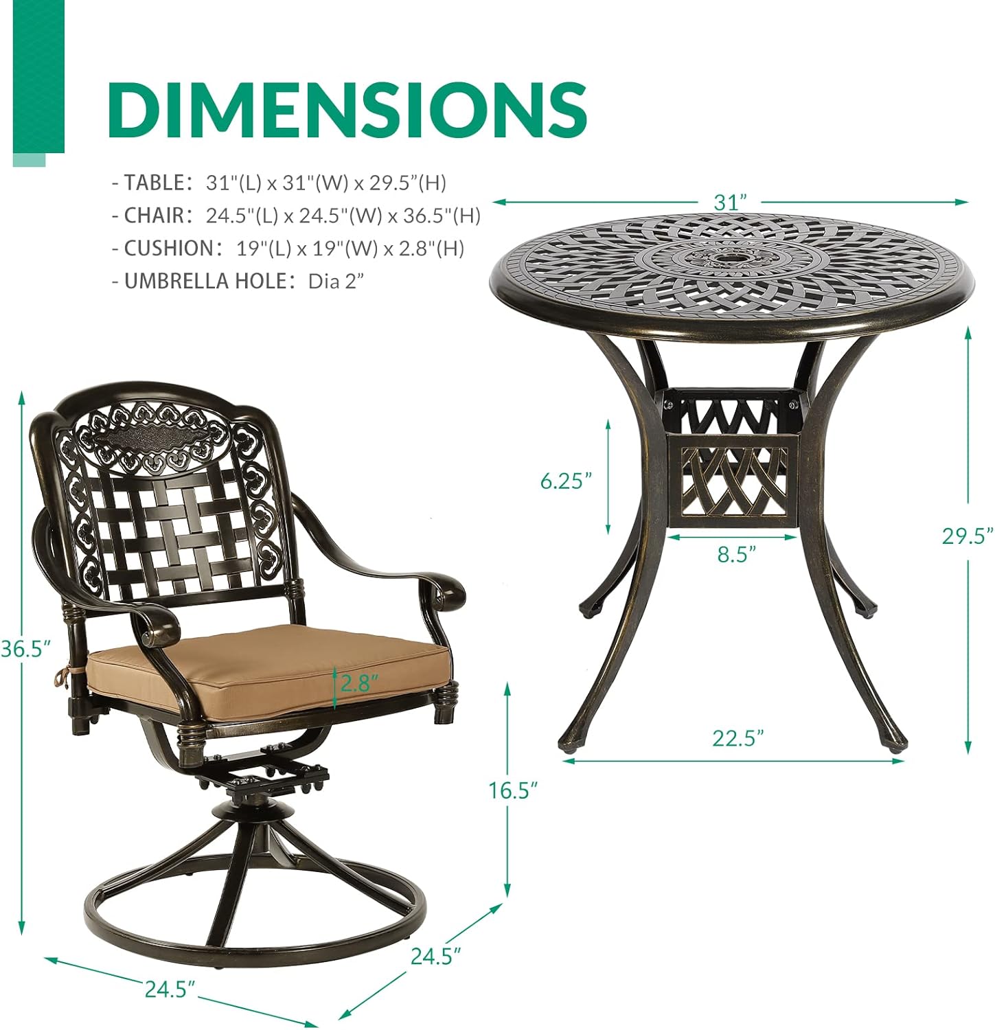 - 【SET DIMENSIONS】 - Table Dimensions: Dia 31" x 29.5”(H); Chair Dimensions: 24.5"(L) x 24.5"(W) x 36.5"(H); Cushion Dimensions: 19"(L) x 19"(W) x 2.8"(H); Umbrella hole: Dia 2”; Weight Capacity of Table: 165 lbs; Weight Capacity of Each Chair: 350 lbs.