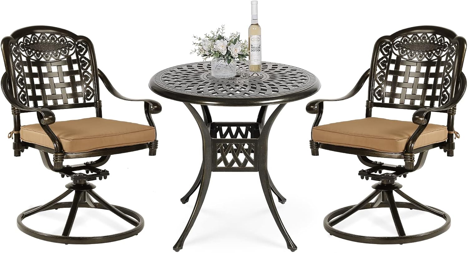 - 【STYLISH APPEARANCE】 - This 3-Piece Dining Set includes 2 swivel dining chairs and 31" round cast table. Elegant cast accents scroll across the chairs and table top, adding a level of sophistication and craftsmanship to the collection. Perfect addition to your patio, yard, deck, or porch.