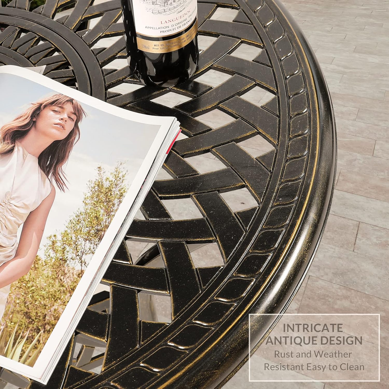 - 【SPECIAL DESIGN】 - Features blooming lattice-weave design combined refined classic style. Built with an umbrella hole (Dia 2") in the center of the table provides you cool and comfortable outdoor activities, and the bottom adjustable foot leveler provide stability on uneven surfaces.