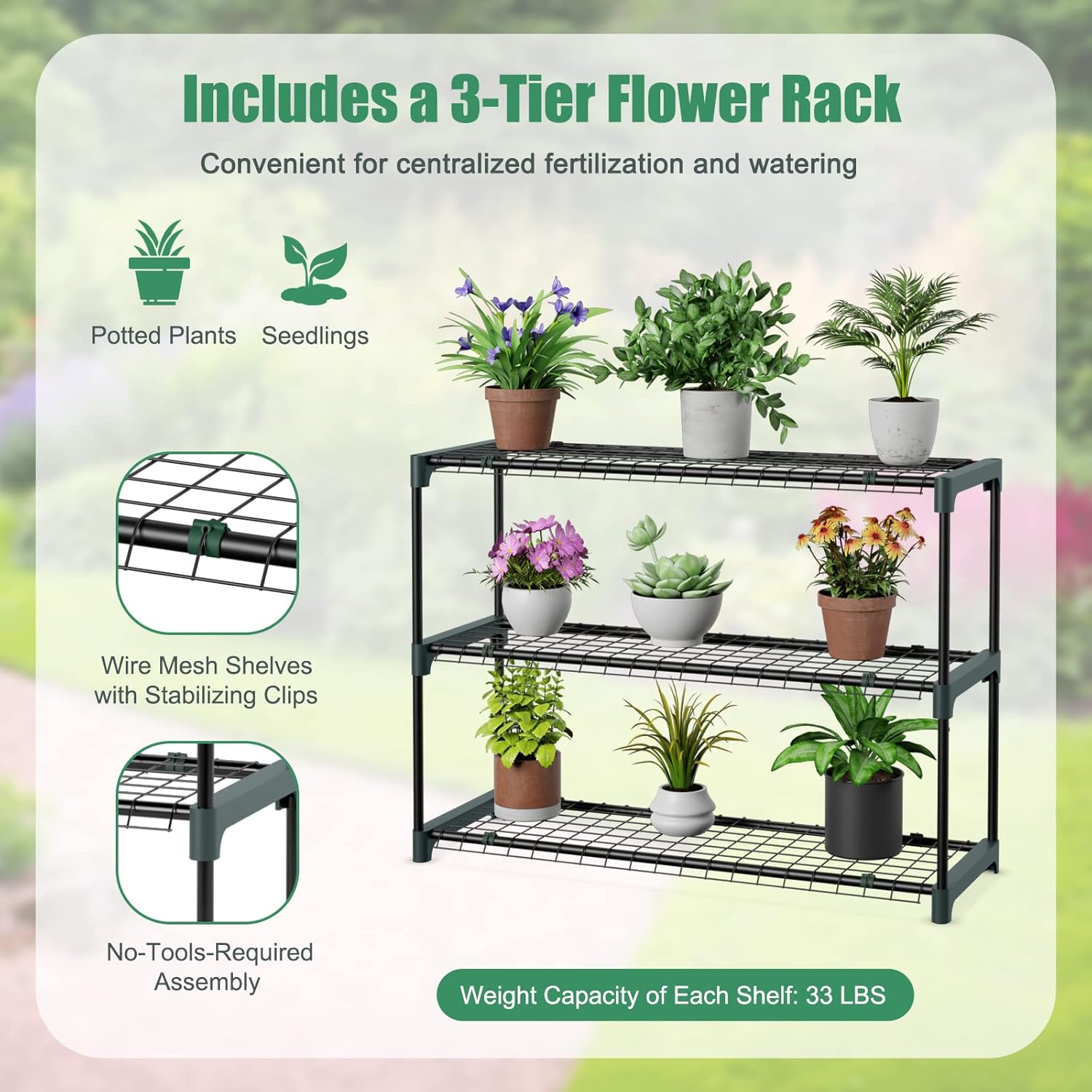- 【 Spacious Space with 3 Tier Plant Stand 】 The walk-in wall greenhouse measures 7' x 3.5' x 7' (L x W x H), providing enough growing space for seedlings, flowers, herbs, vegetables, fruits, and more. Besides, it is equipped with a 3-tier flower rack, bringing convenience for centralized fertilization and watering