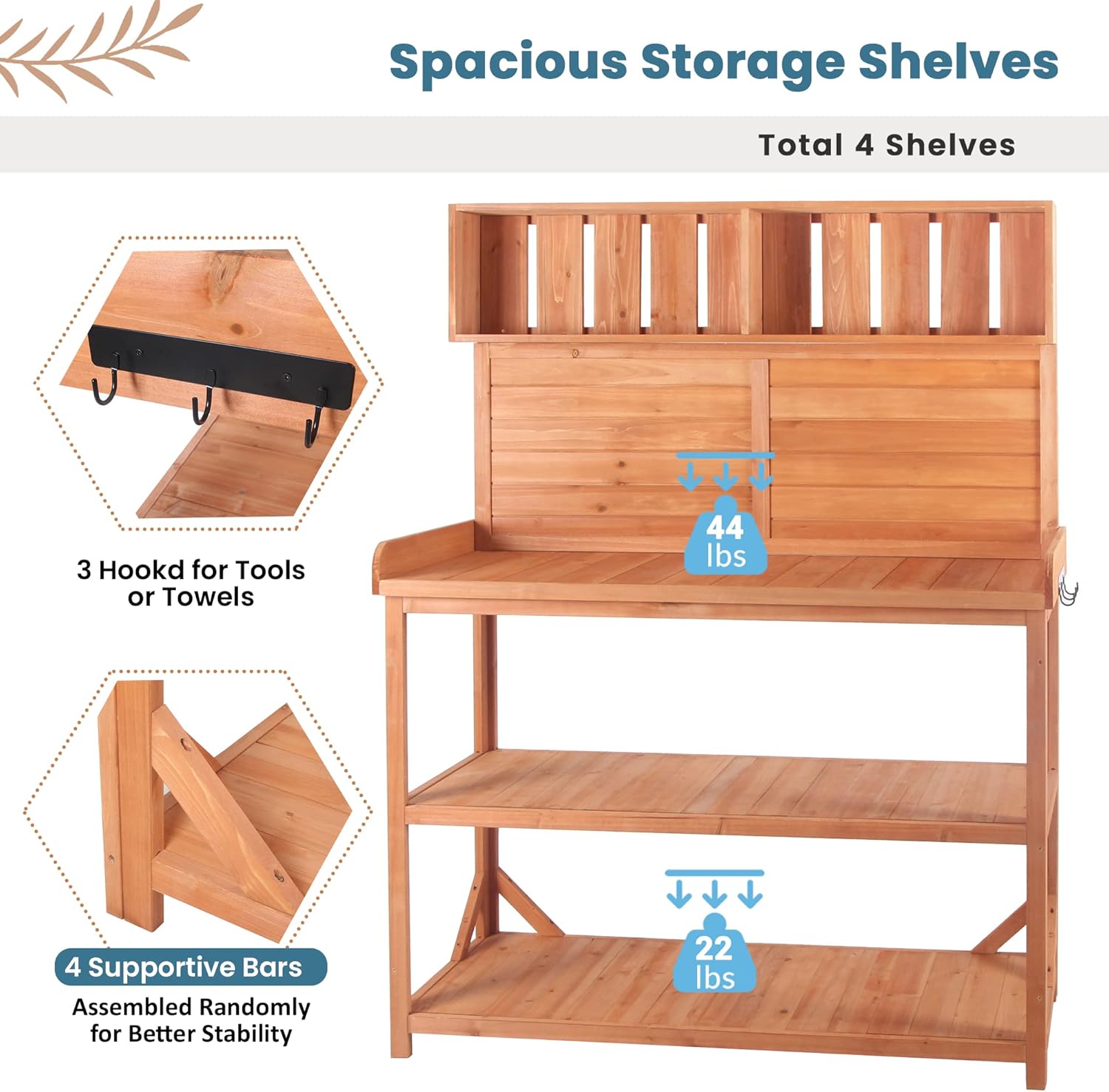 - Anti-Falling Safety Device: There is not always a flat in the garden. For your safety in setting the potting bench, it is designed with an anti-falling device. Just connect the device to a wall for better safety. To strengthen stability, 4 supportive bars are offered to fix in the lower shelves. They can be fixed in any corner until the table is stable.