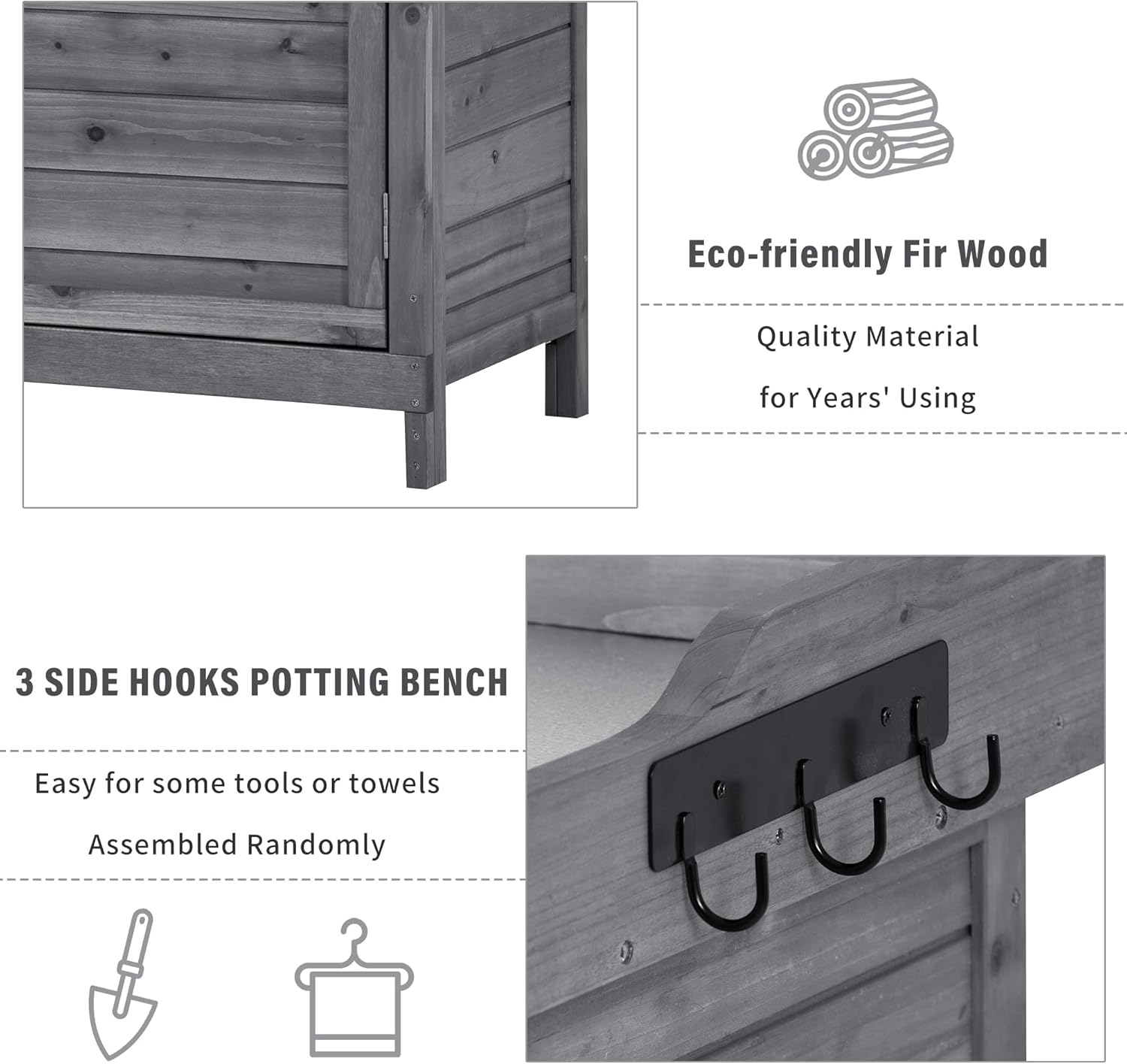 - Handy Side Hooks: For your convenience, our potting bench is designed with 3 side hooks. It can be assembled in different places not only on the right side as long as it is handy for your tools like gloves, towels, or some small tools.