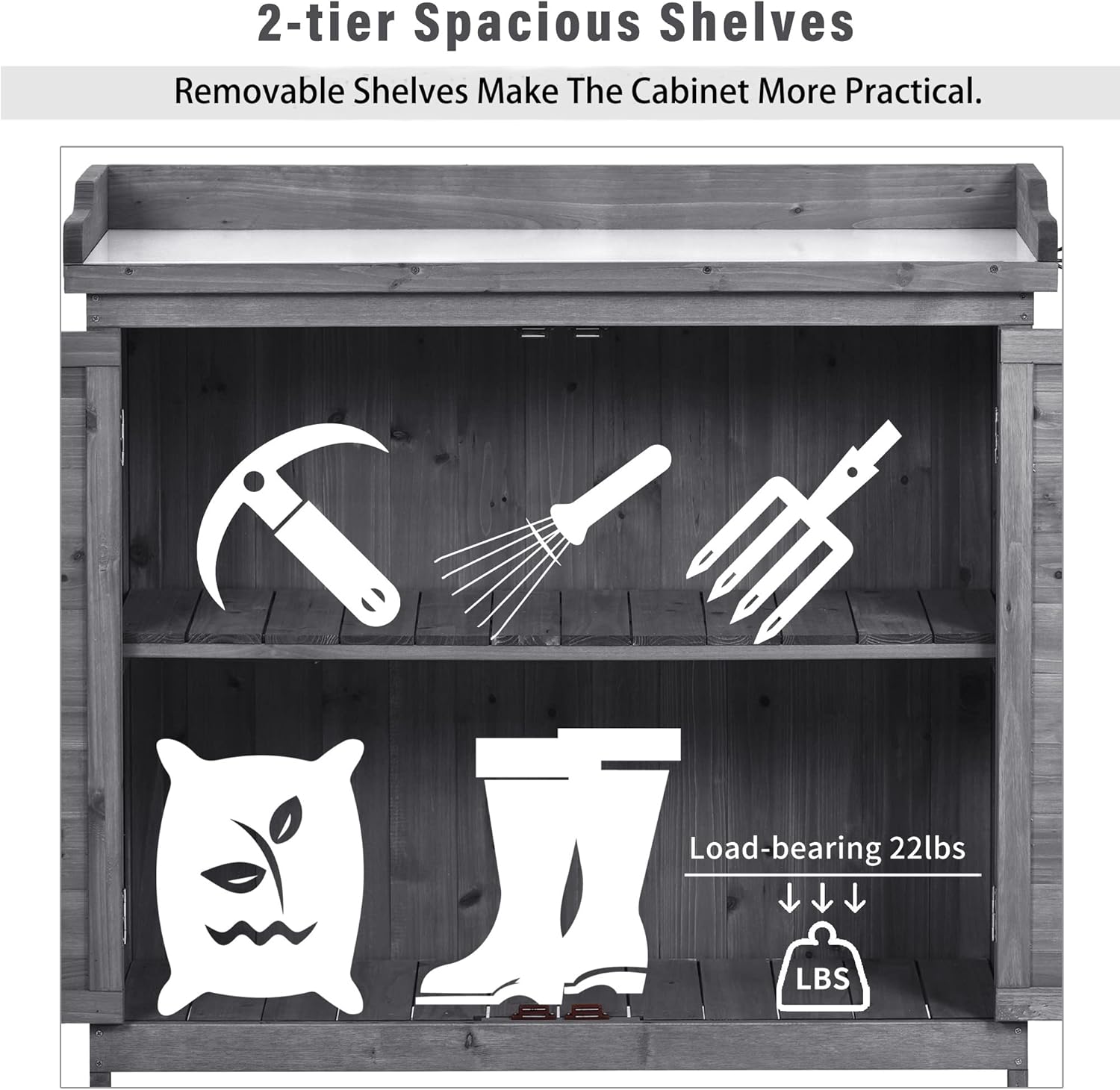 - Ample 2-Tier Storage Cabinet: If you are a big fan of gardening, this potting bench will be a great choice. With a 37.4" total height, 2 ample storage shelves are designed to keep your tools handy and in one place without bending over or squatting. Constructed with a removable shelf, this potting table is ample enough for not only small tools but also extra soil, pots, and other gardening supplies.