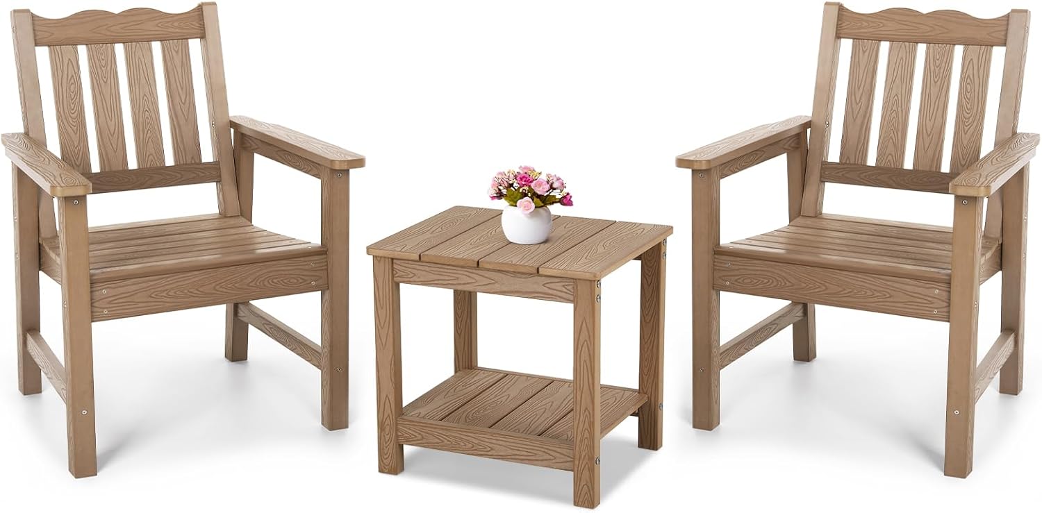Stoog 3-Piece All-Weather Garden Chairs Set of 2 with Table, Outdoor Dining Chair with 400 lbs Weight Capacity, Patio Bistro Set for Porch, Backyard, Lawn and Deck, Teak