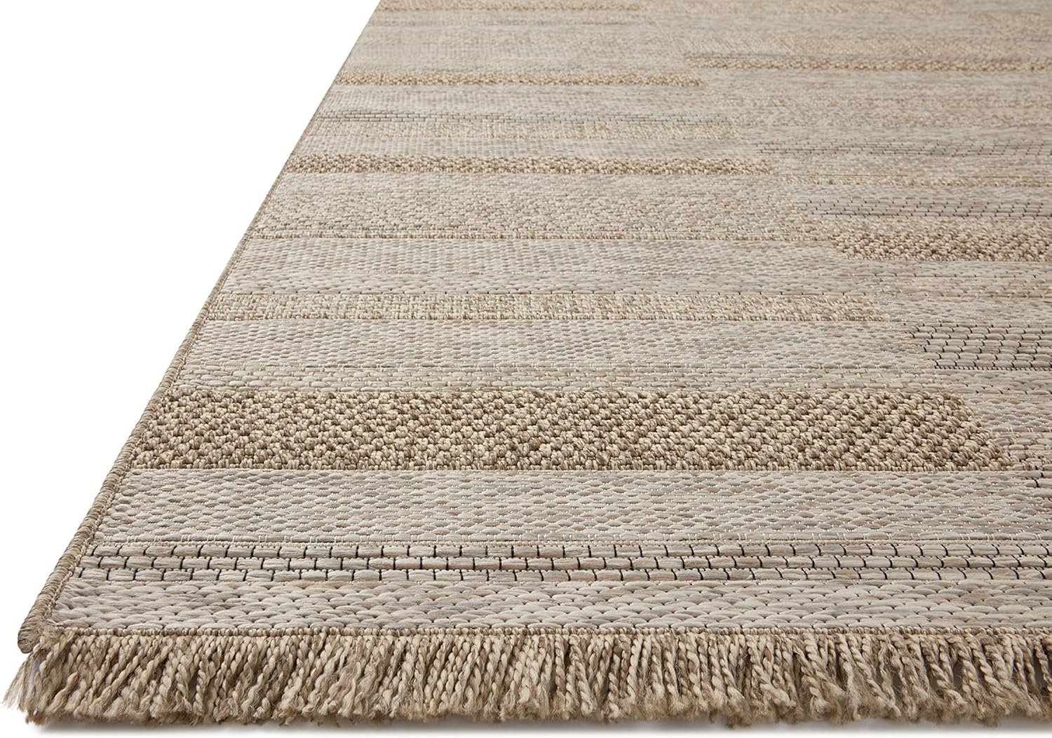 - The Dawn Collection is a sophisticated indoor/outdoor rug with a neutral graphic design that resembles sisal and has short fringe at its edges