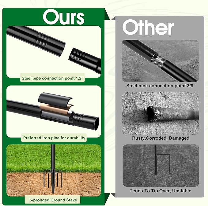 - 【Sturdy Design】 Made out of black metal for a sturdy design, 3 piece collapsible pole for easy storage. Upgraded with 4 extra long and double-forked base prongs to be total 5 prongs which makes it the strongest garden flagpole in the market and maintain a fixed, upright posture while remaining firmly planted in the ground without easily falling down.