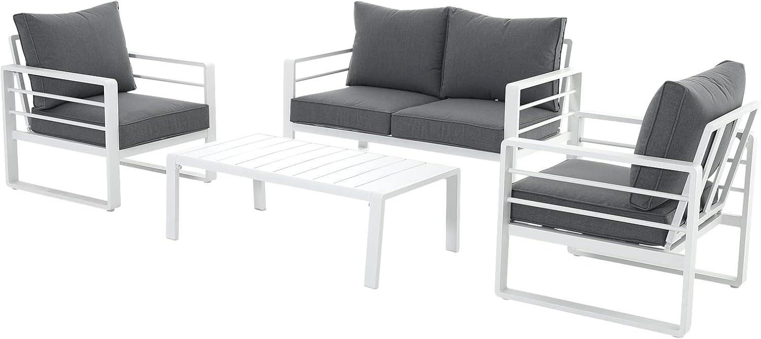 Patiorama Aluminum Patio Furniture Set, 4 PCS Modern Patio Conversation Set, All Weather White Outdoor Sectional Sofa Set w/Coffee Table, Loveseat, Superior Olefin Cushion, Garden-Grey Cushion