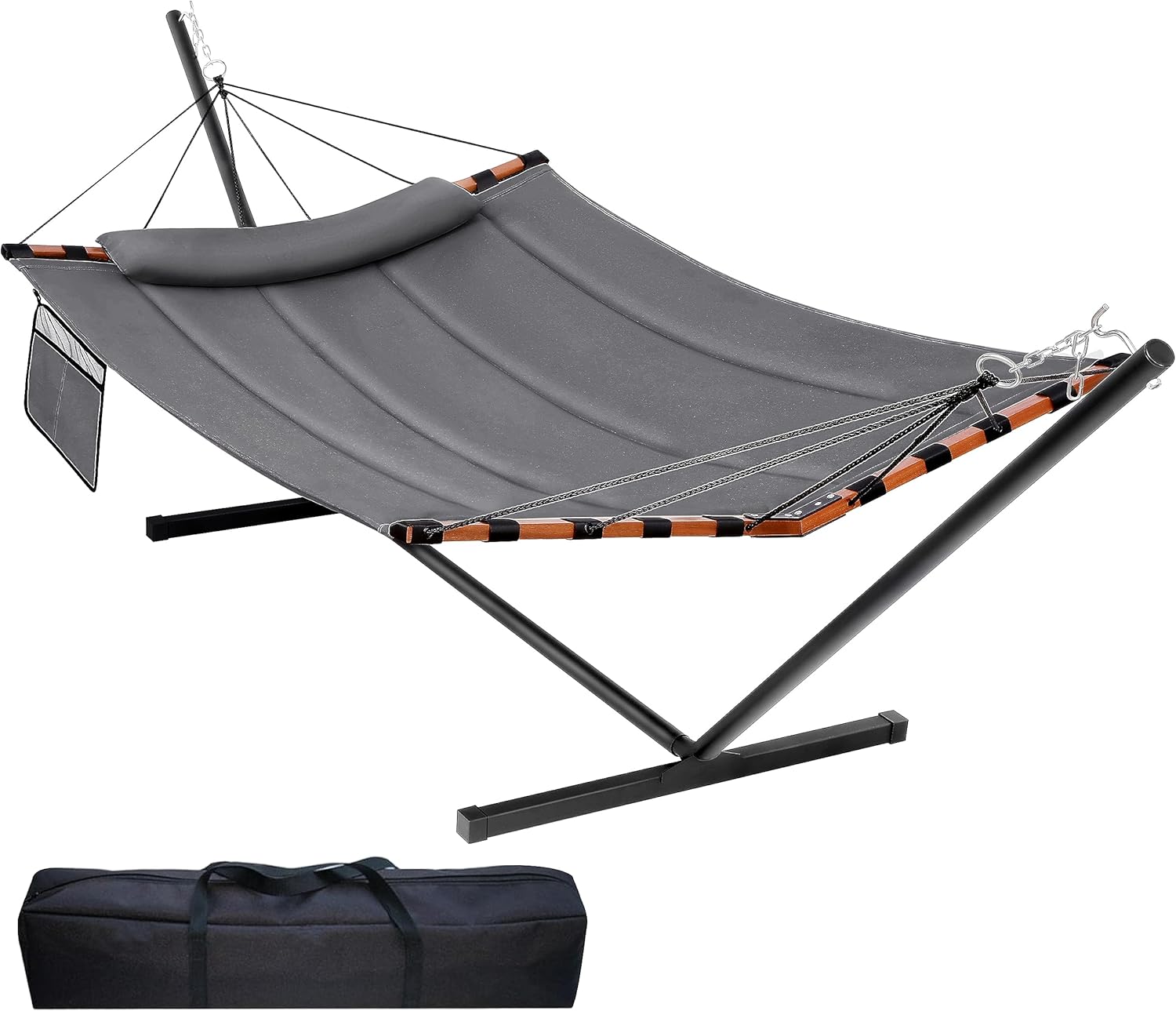 TegerDeger 12FT 2 Person Hammock with Stand Included 55 x 79IN Large Hammock 450LB Capacity with Hardwood Spreader Bar & Nylon Rope for Outside, Patio, Garden, Backyard, Beach, Poolside - Gray