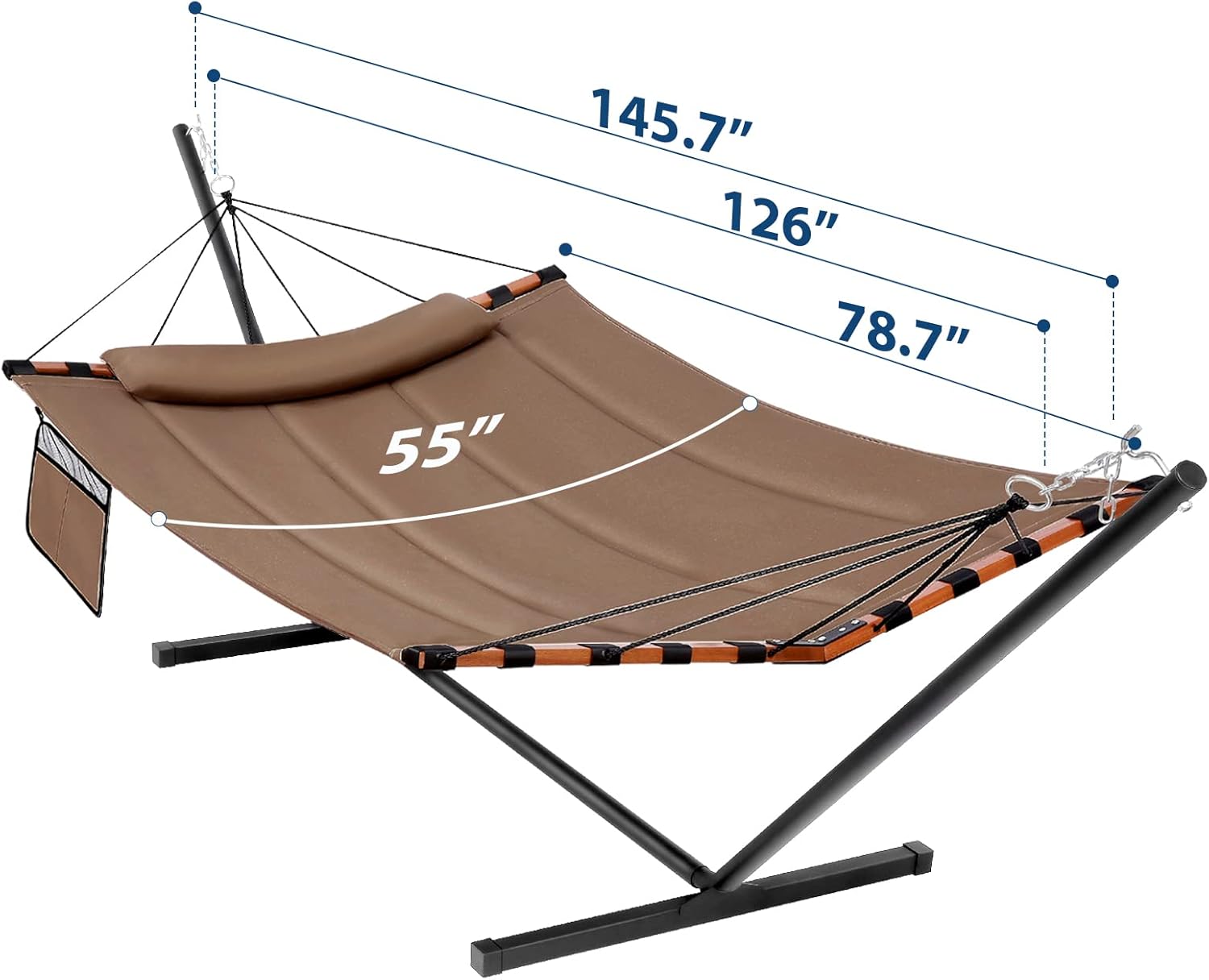 TegerDeger 12FT 2 Person Hammock with Stand Included 55 x 79IN Large Hammock 450LB Capacity with Hardwood Spreader Bar & Nylon Rope for Outside, Patio, Garden, Backyard, Beach, Poolside - Brown