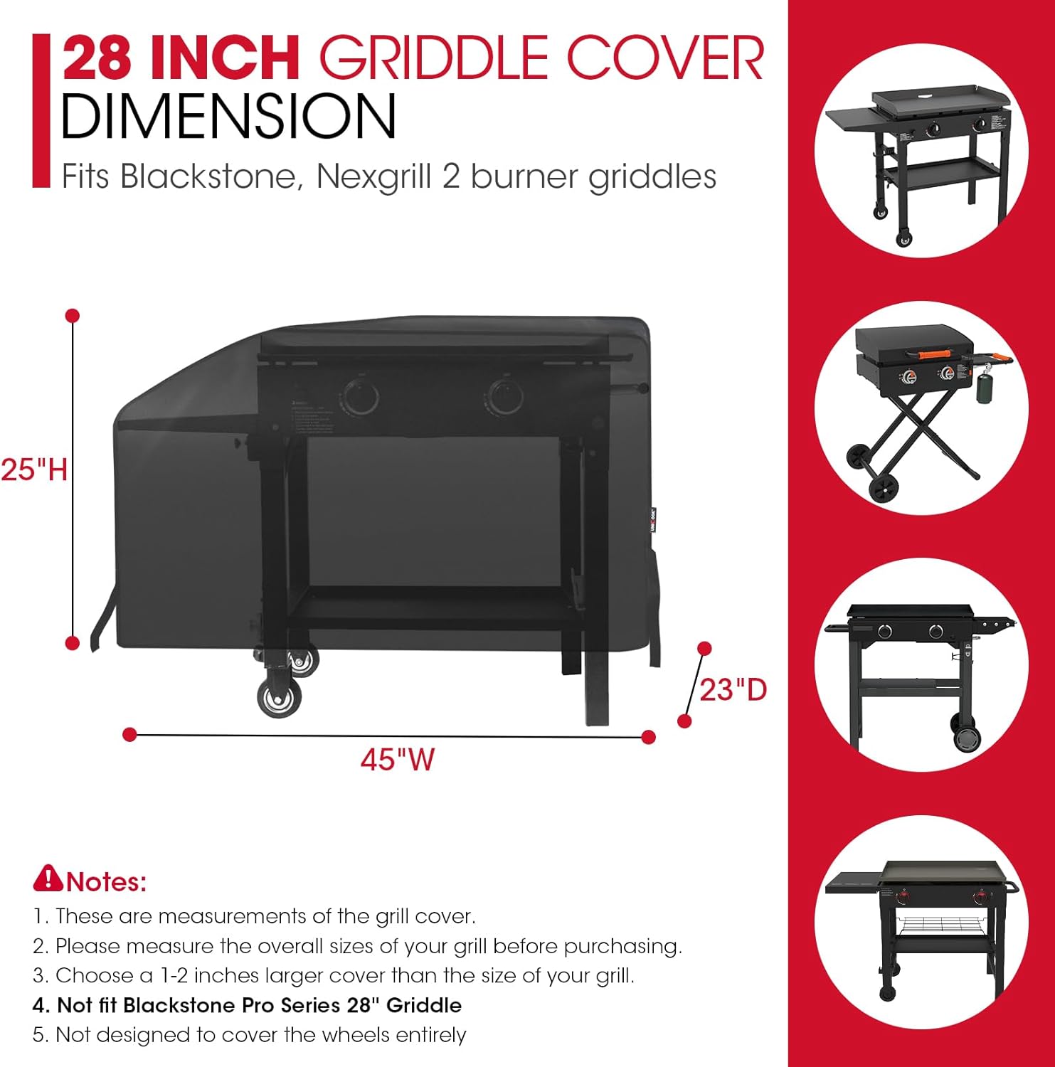 - Waterproof & Durable Material: Grill griddle cover 28 inch is made of heavy duty and fade resistant polyester with waterproof vinyl lining, added the hot melt seam sealing tape to enhance the waterproof performance, protects against rain, snow, sun, wind and dirt, keep it dry and clean under harsh weather