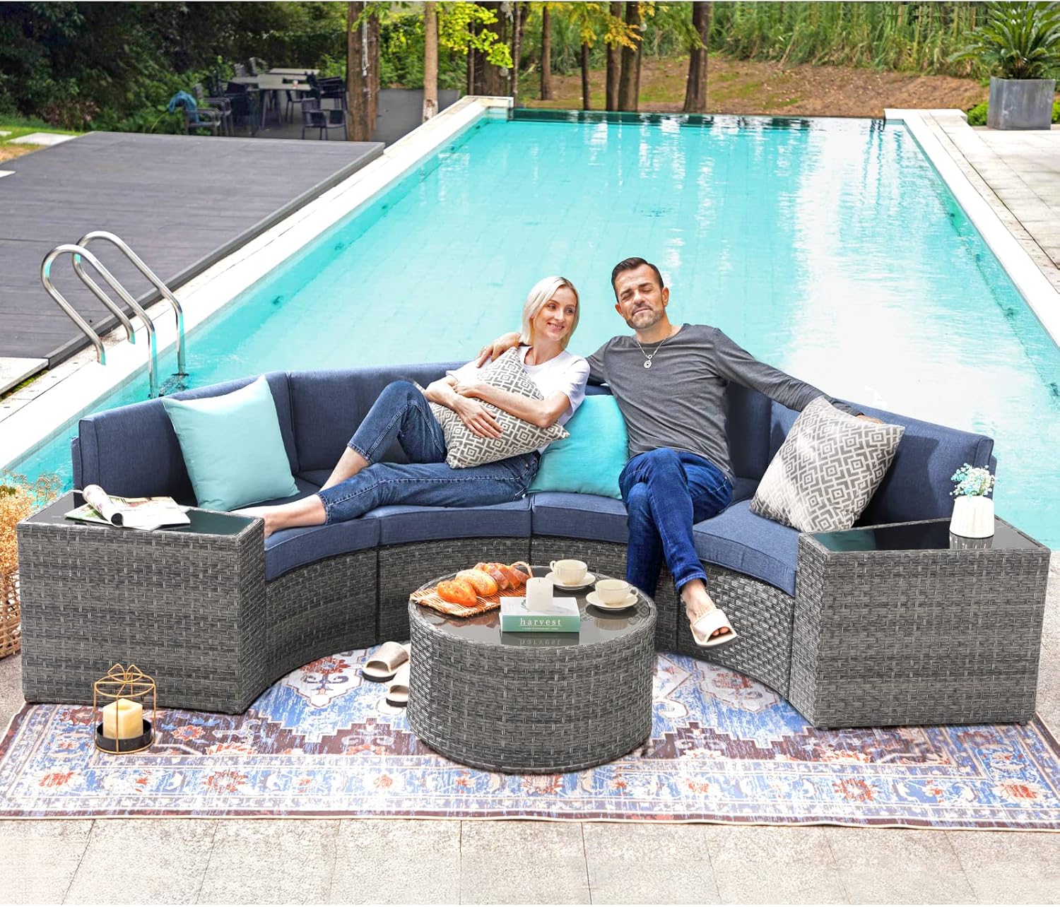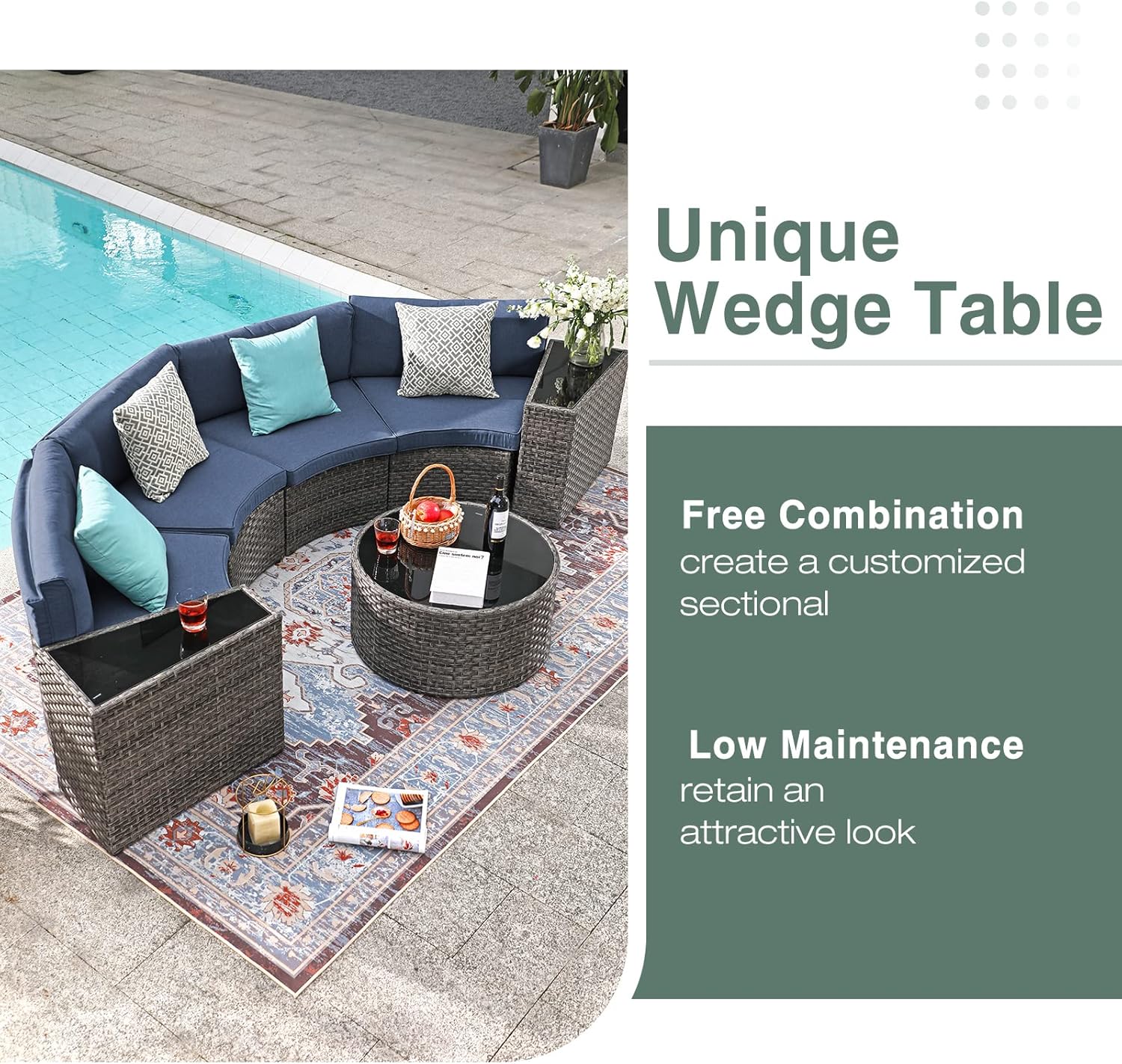 - STYLISH DESIGN – Rich grey resin wicker in complex pattern paired with denim blue cushions for a refined, textured look, halfmoon patio furniture is the perfect addition to outdoors. Pure green & grey lattice fancy decorative pillows combined to really make the sectional sofa set stand out.