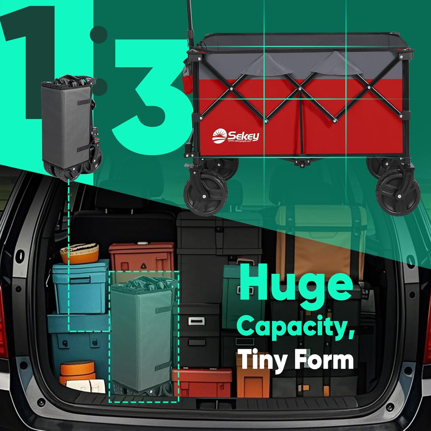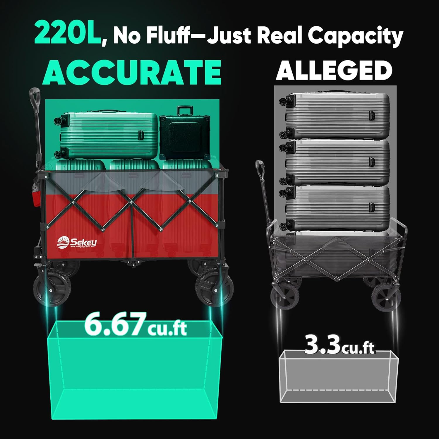 Sekey 220L Collapsible Foldable Wagon with 330lbs Weight Capacity, Heavy Duty Folding Utility Garden Cart with Big All-Terrain Beach Wheels & Drink Holders.Red&Grey