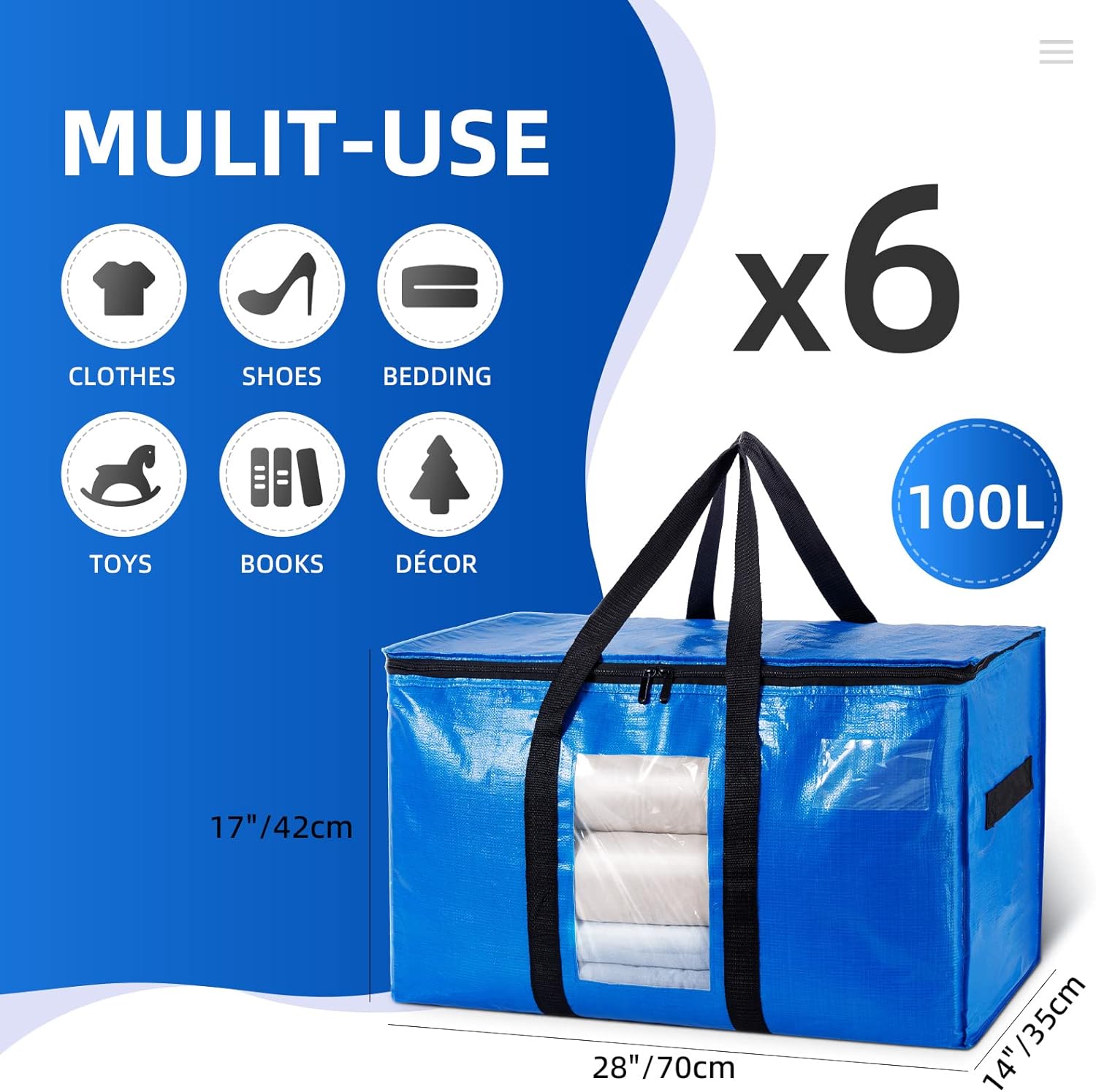 TAILI Extra Large Moving Bags, 6 Pack Blue Heavy Duty Totes For Storage with Visible Window, Wrap Around Handles, Storage Bags for Space Saving, Alternative to Moving Boxes