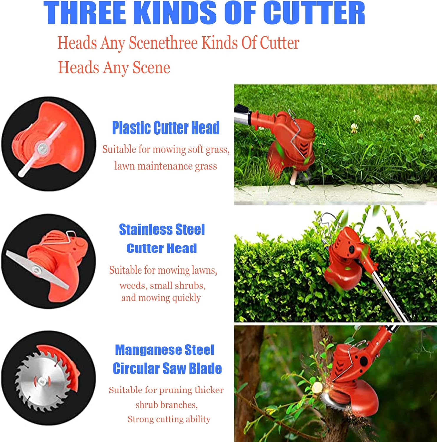 - 【3Kinds Blades Included 1 Round Saw Blades】Cordless string trimmer comes with 3 types blades,The plastic blades work like heavy duty string, which is great for soft grass. The metal blades work like a miniature lawn mower blade and cuts through weeds,lawns and small branches. manganese steel round saw blades for cutting thicker brushes and branches.After using blade, please put back in the original packaging bag (with oil inside) to save, which can extend the service life of the blades.