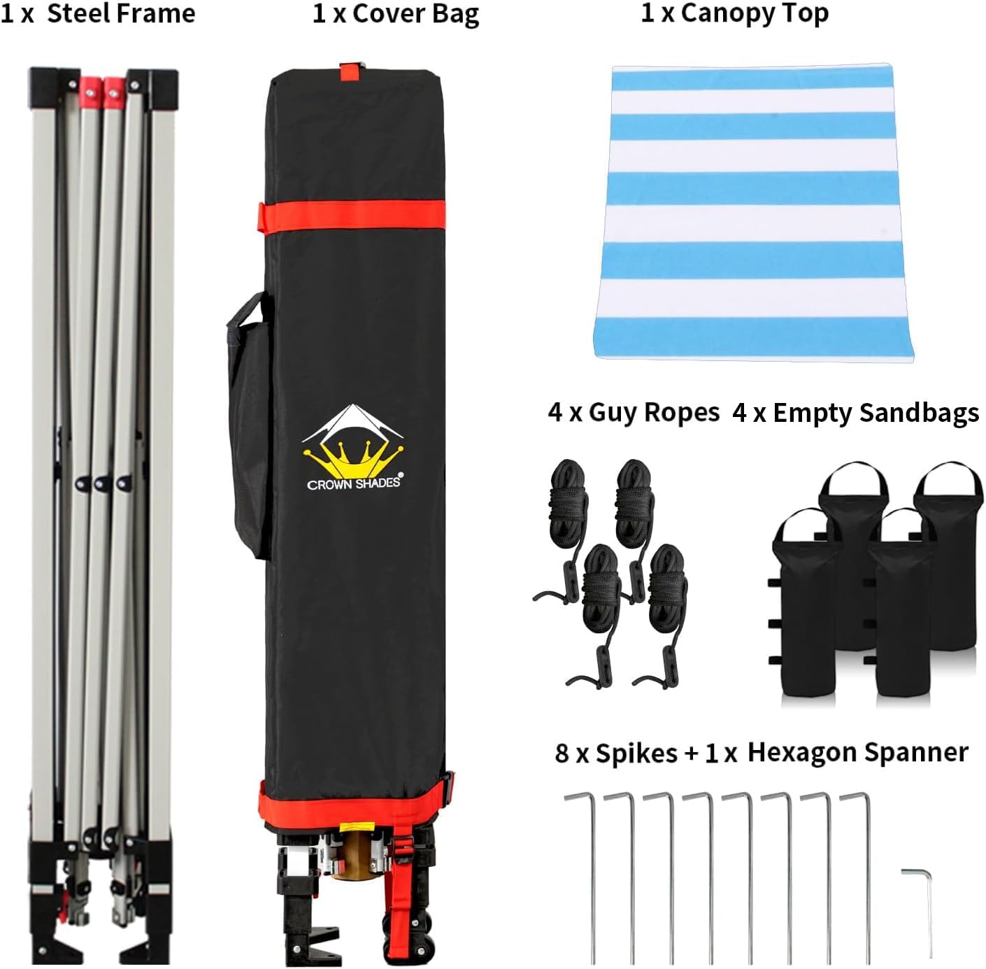 Crown Shades 10x10 Pop Up Canopy - Beach Tent with One Push Setup - Outdoor Sun Shade for Events, Parties, Camping - STO-N-Go Cover Bag, Silver Coated Top, 3 Height& 4 Sand Bags, Sky Blue Stripes