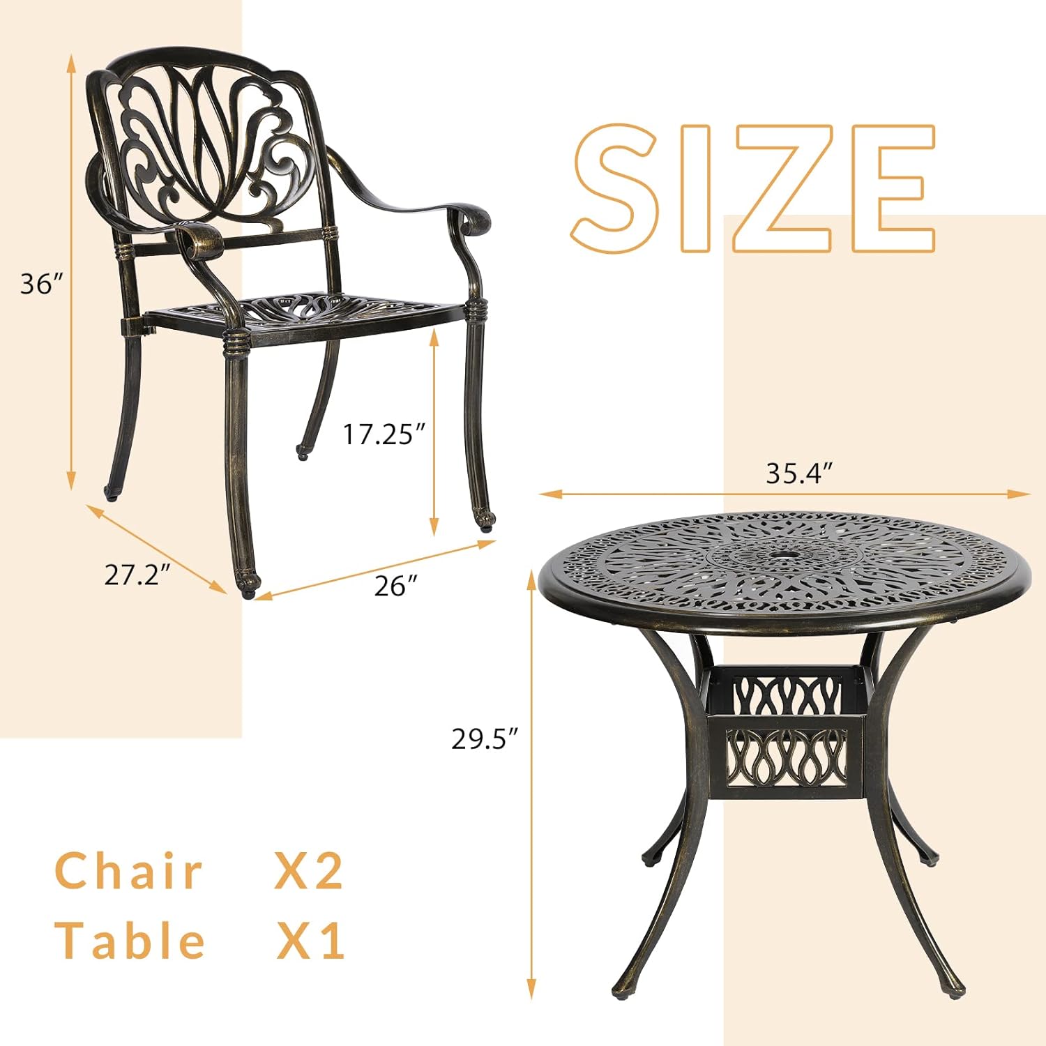 - 【Dimensions】 - Our round table is 35.4"(Dia) x 29.5"(H), and each of 2 chairs is 26"(L) x 27.2"(W) x 36"(H), you’ll love how this furniture set uniquely accents your space. Quickly assemble so you can enjoy it in no time, all hardware, tools and instructions required are included for easy assembly.