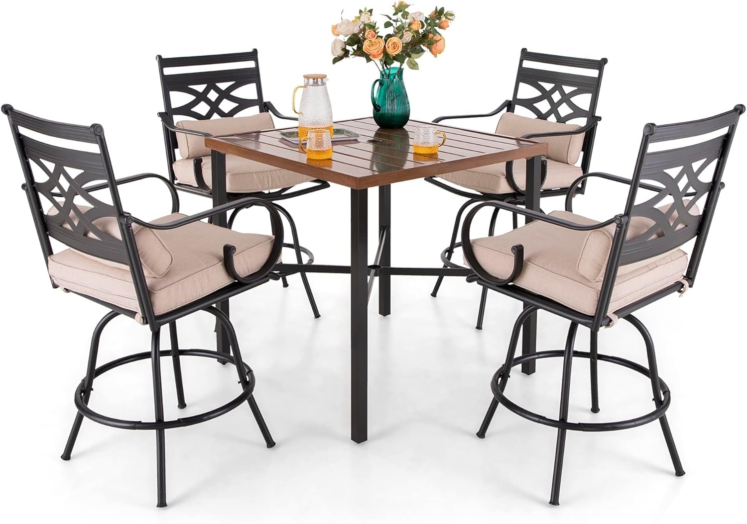 Sophia & William Outdoor Patio Bar Set 5 Piece High Dining Table and Chairs Furniture Set-4 Swivel Bar Stools with Beige Cushion and 1 Square Bar Height Table with Hand-Painted Metal Top