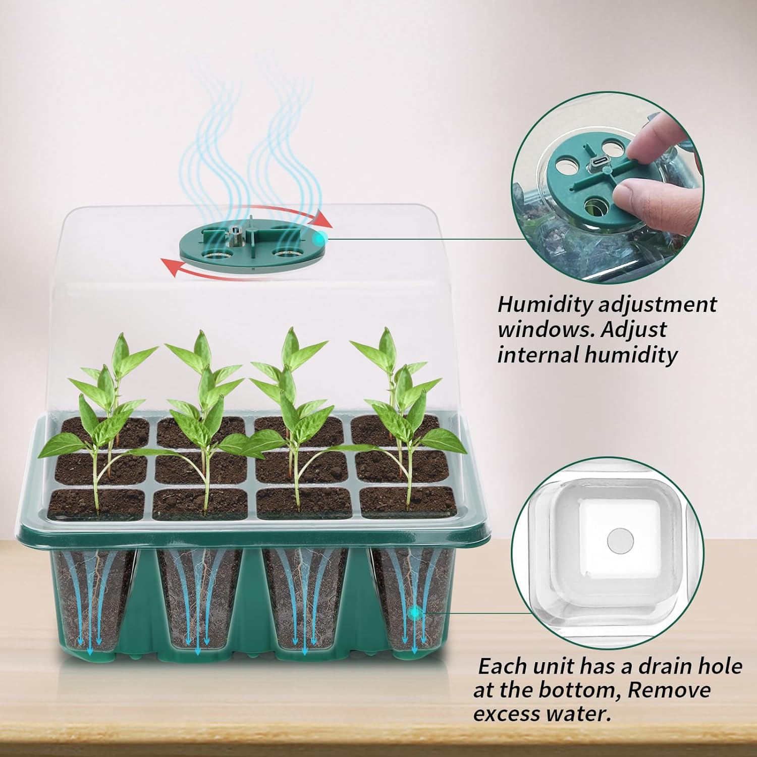 - 【Adjustable Humidity Vent & Drain Hole】There is a humidity vent at the top of the transparent dome. You can freely adjust the humidity of the seedling environment. Each gardening grow kit of the seed starter has a drain hole at the bottom, which prevents root rot due to excessive moisture in the seed starter soil and effectively protects the healthy growth of the root system.