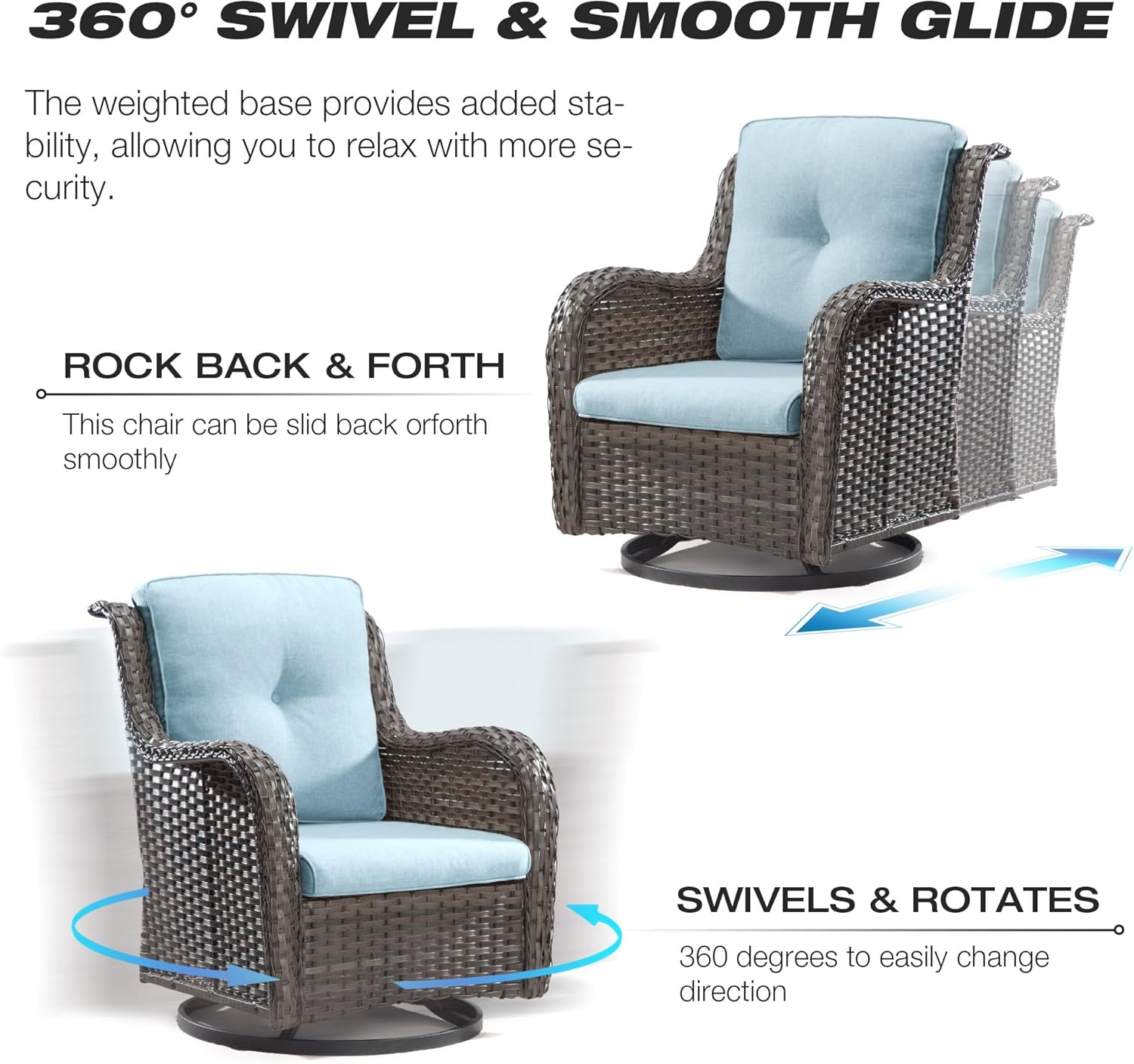 - Smooth Rocking & Swivel Design: This bistro chairs are finished with a gentle rocking design that can create a soothing motion for you to enjoy. The chairs can also rotate 360° smoothly, you can swivel effortlessly while sitting