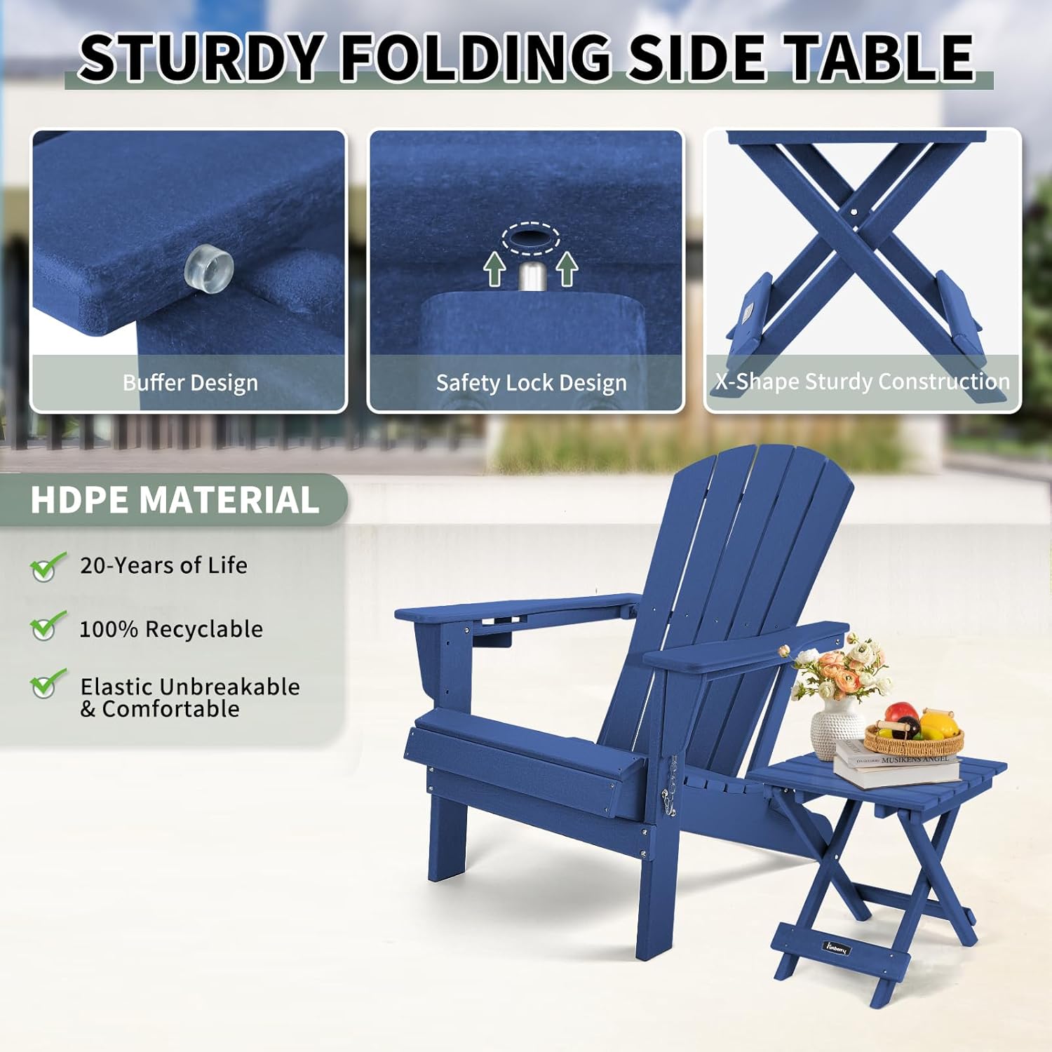 - Weather Resistant Durable Material: This Adirondack side table is made of HDPE (High Density Polyethylene) material, which makes it highly durable. This side table can withstand extreme climates without fading, cracking or rotting comparing to other materials like wood or plastic. This patio side table is waterproof, heat resistant and UV fade resistant.