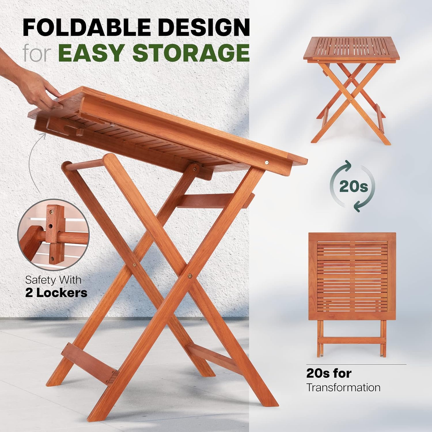 - 🍁 PREMIUM EUCALYPTUS WOOD - Our folding side table outdoor is expertly crafted from FSC-certified eucalyptus wood, coated with high-grade oil-based that protects the surface from UV rays & provides weather resistance