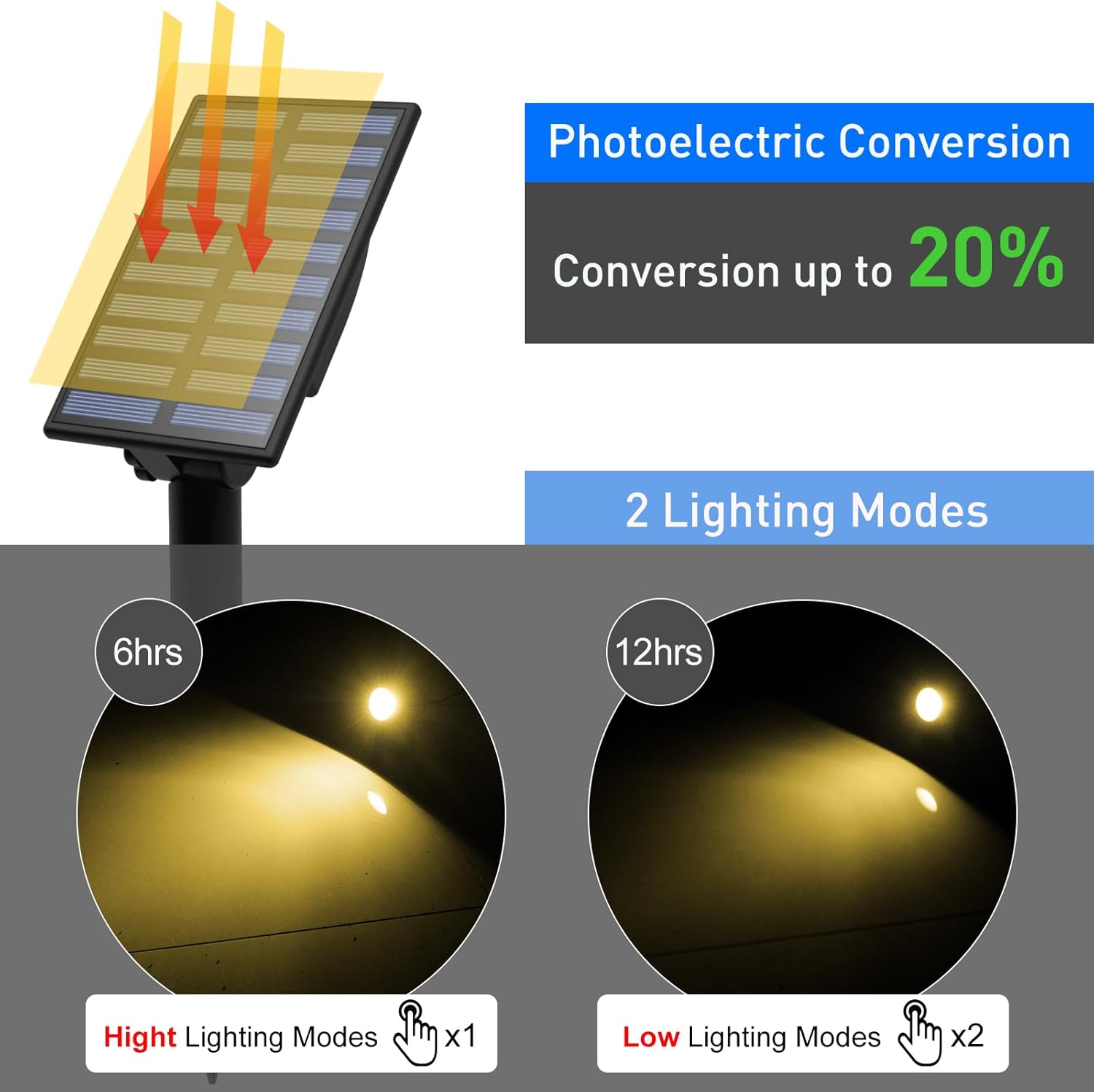 - 【2 Mode & 2 Types of Installation 】 The solar spot lights have High and Low light modes, high light continuously last for 8 hours and low light for 12 hours. The solar lights can be easily inserted into the ground or mounted on the wall with included accessories, making them convenient to install and use.