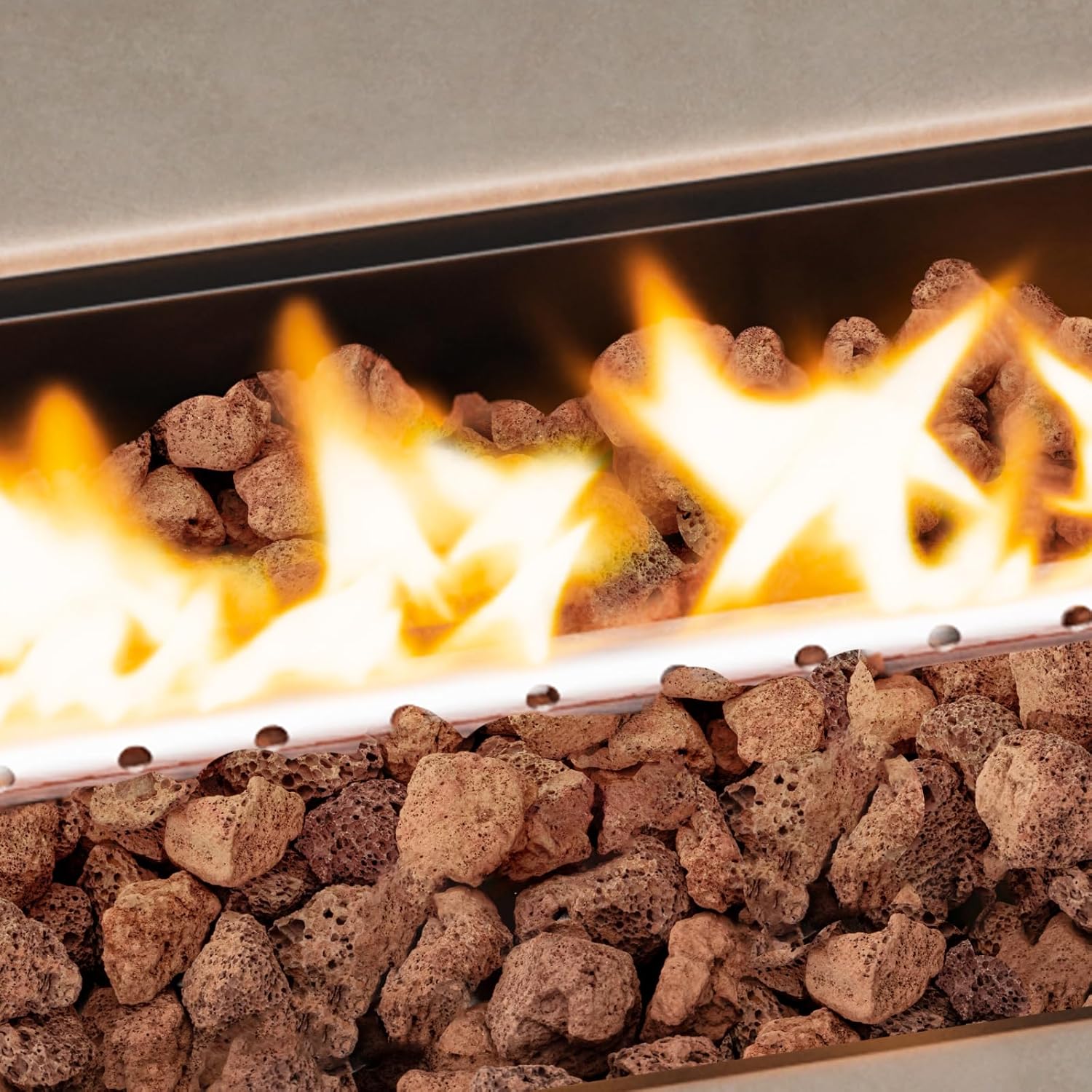 - 🔥 【 SUNDOWN, FUN UP 】: When the sun sets and your outdoor paradise begins to cool a bit, no need to go inside. Light the fire pit table and warm up the patio night! You can even serve an intimate dinner for four right on the spacious ledge surrounding the warm glowing lava rocks. What could be cozier? Clean burning propane flame provides soothing warmth, gentle lighting and a centerpiece for many outdoor or backyard evenings worth remembering.