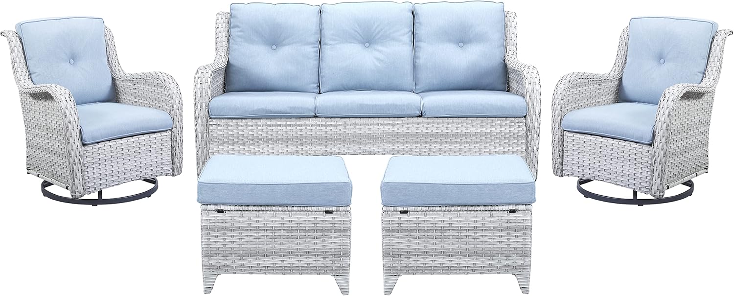 - Patio Furniture Set Introduction: The 5-piece patio furniture set includes 2 swivel glider chairs, 2 ottoman and a sofa, ottoman can not only be used to relax your legs, but also can be used as a small table or small stool. The swivel chairs can hold up to 350 pounds.