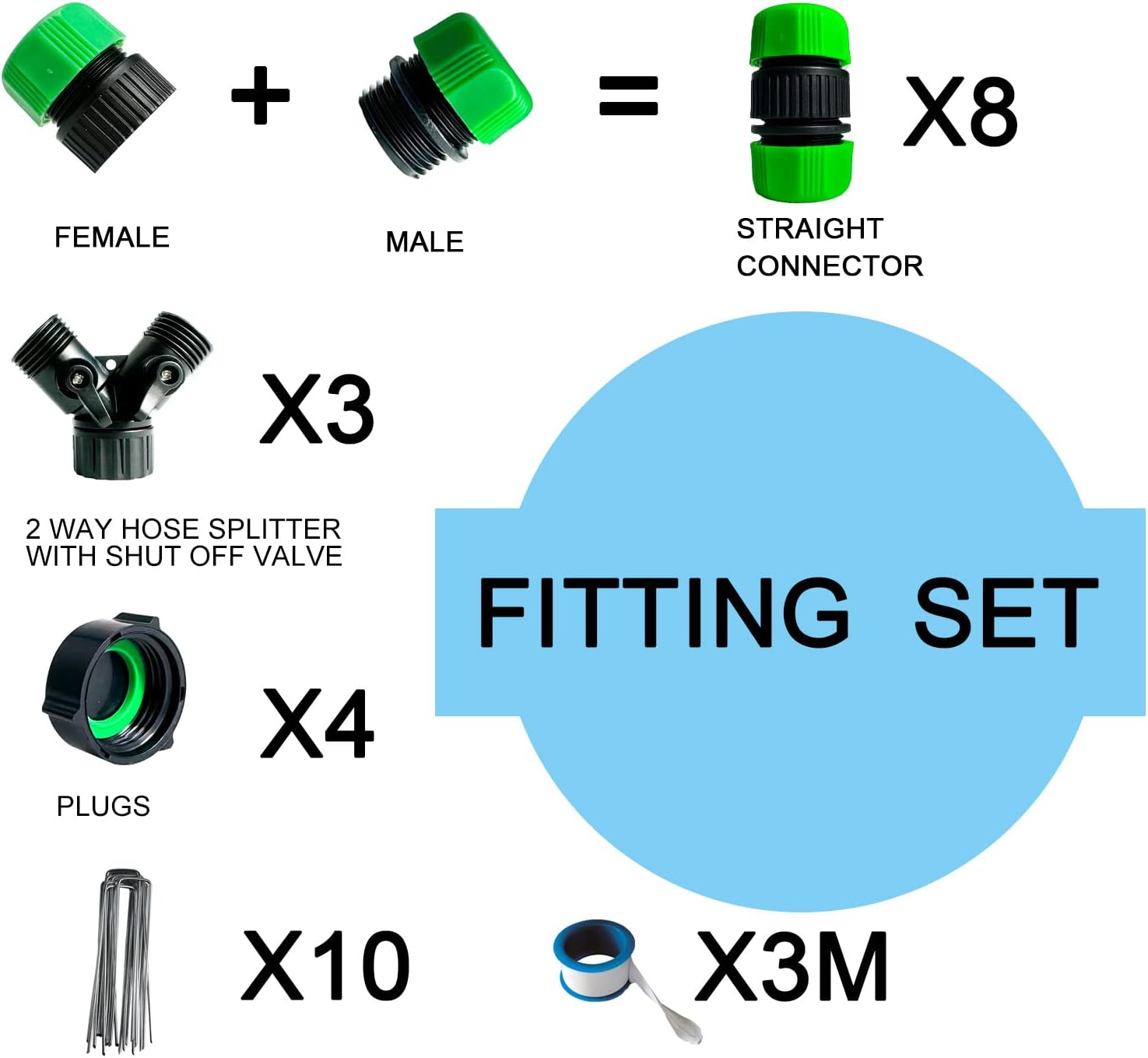 - Amrita Soaker Hose & PVC Garden hose ; Package Include:1/2" soaker hose*60ft, 1/2" PVC garden hose *50ft, ( Male+female )connector*8, 2 Way hose splitter with shut off valve*3, Garden stakes*10, Seal tap*1