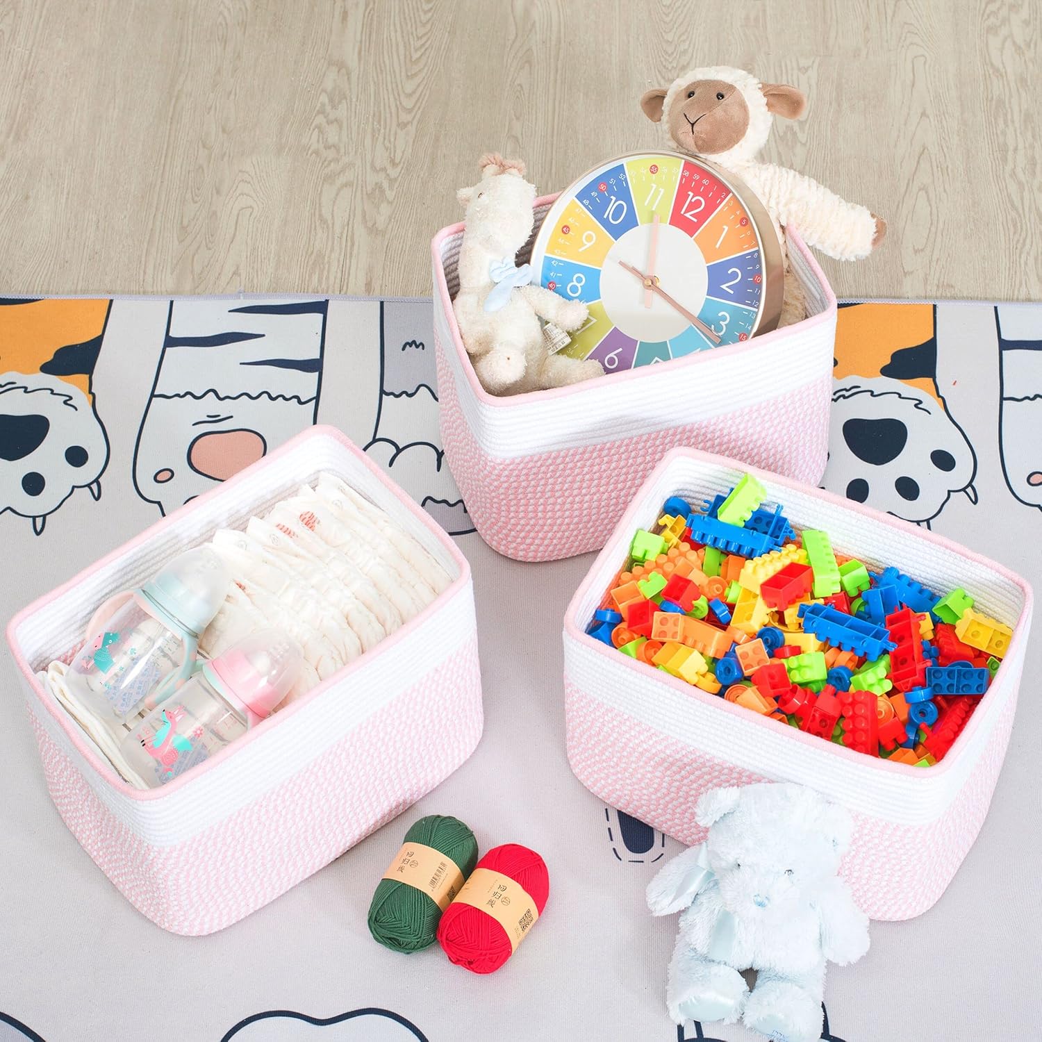 - Decorative Cute Woven Basket - A stylish and practical way to create eye-catching table and counter-top displays. Not only will our basket set help you get organized, but their sleek, sophisticated shape and neutral color will complement any decor. Put them on a nightstand, a bedside table, a nursery side table, walk-in closet, shelves, kitchen countertop, or bathroom vanity top to add character to your rooms while keeping everything organized.