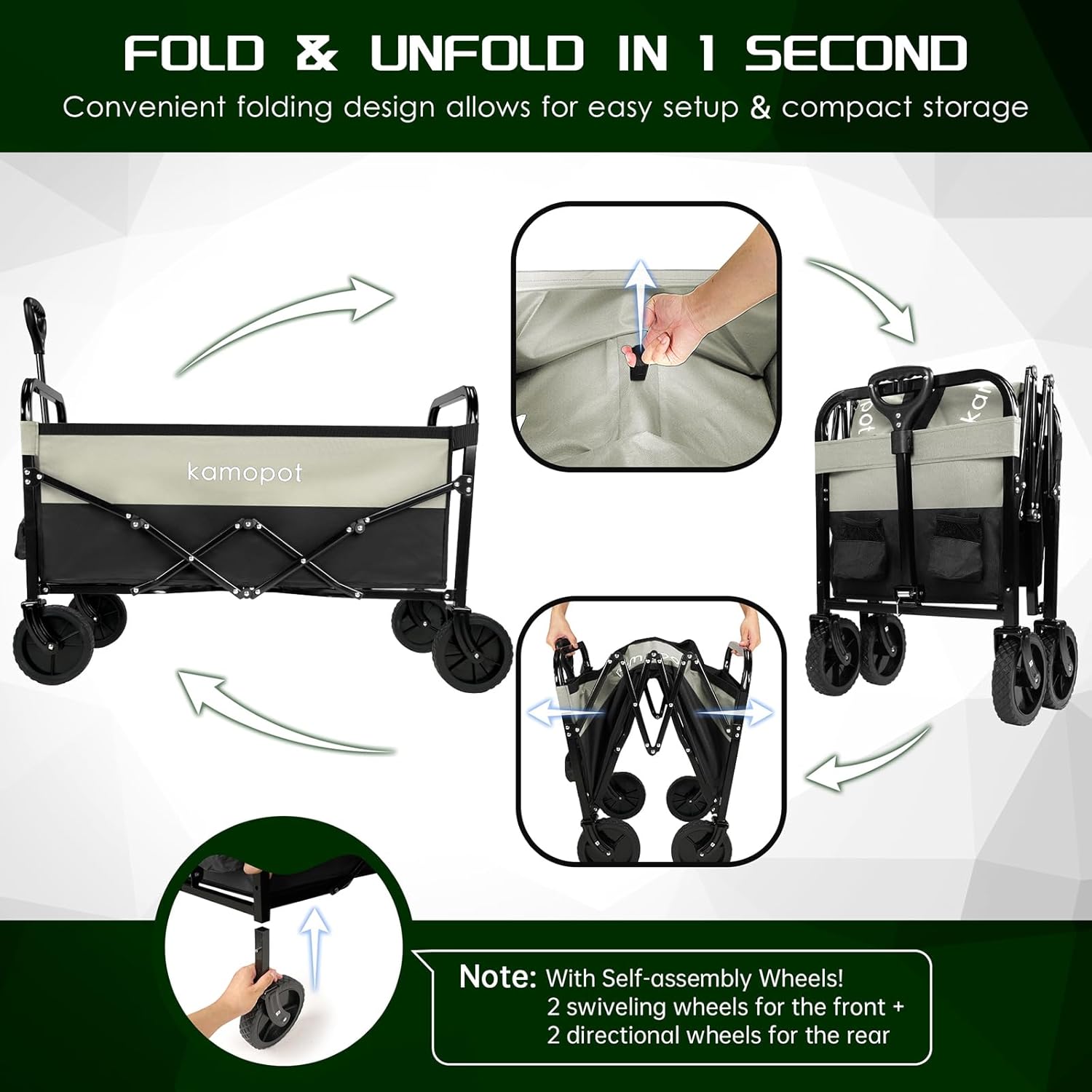 - COLLAPSIBLE WAGON: Kamopot's heavy duty utility wagon is collapsible or foldable. It can be folded or unfolded in just 1 second. Super easy to use, and convenient to put it into the car to transport or store somewhere. Please note that 4 wheels have to be self-assembled at first time of use.