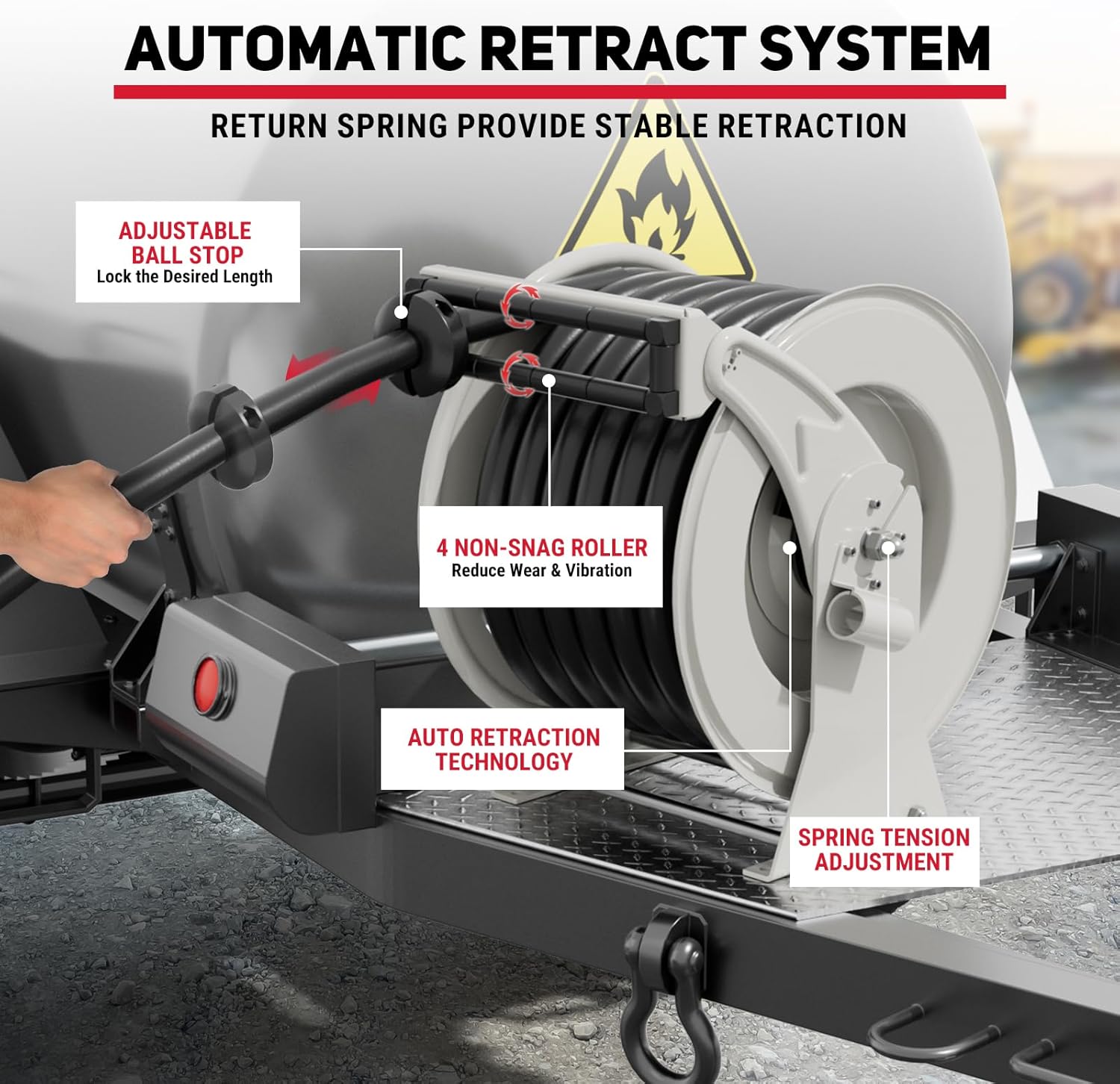 - Easy Maintenance: 1 inch hose reel for compatibility with diesel fuel, ensuring smooth, without fuel leaking. Including a 360° rotating connection seal to prevent the hose from twisting when refueling, and ensure that the fuel nozzle is not moving and does not easy to leak. The reel is well-suited to all industries including Agriculture, Industrial, mining, and Transportation. You can contact us at any time and we can help you solve all product problems