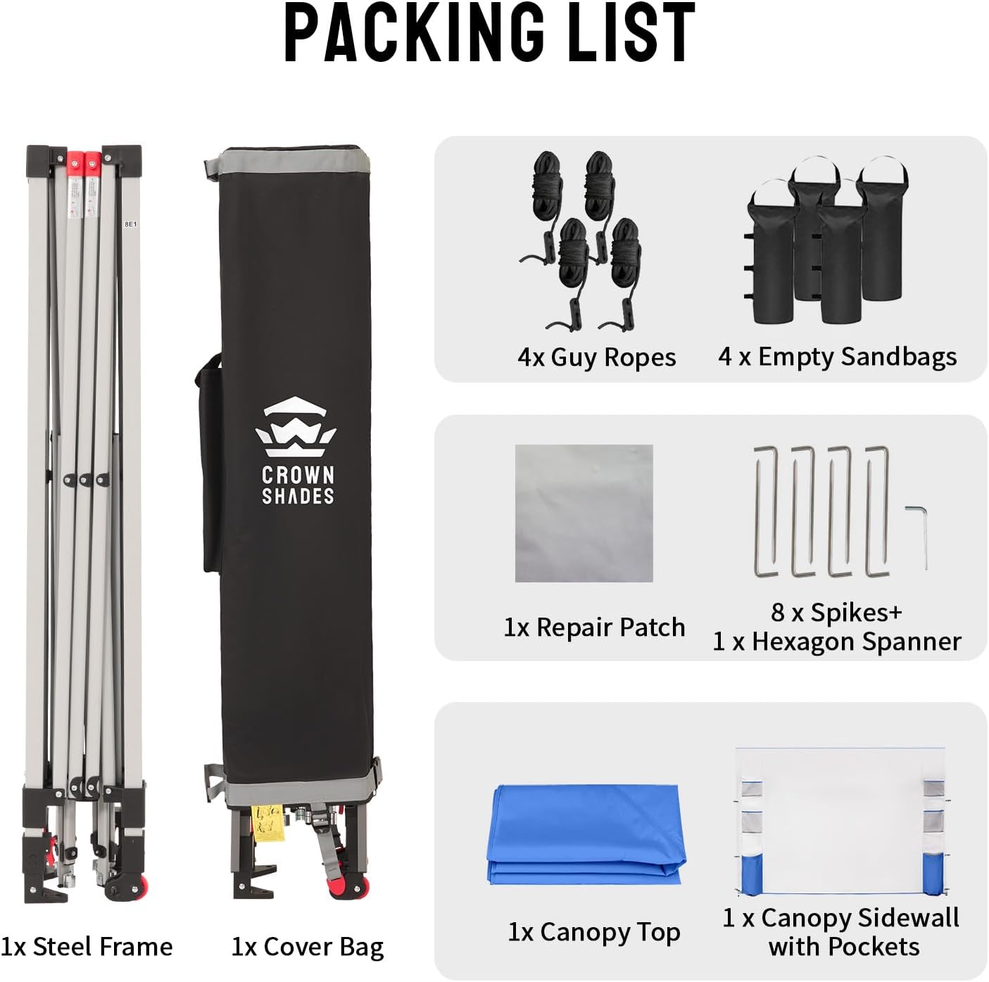 - STO’ N GO SYSTEM - Our lift-free storage and transport system makes it easy to collapse the canopy, cover it with the bag, and roll it away. The canopy can be stored with the fabric attached, with a specialized pocket for the sidewall, 4 sandbags, 8 stakes, and 4 guy ropes. Integrated wheels in the feet allow easy movement even when the canopy is set up, by simply lifting the side without wheels. This feature is useful for quick setup and takedown at locations like the beach, park, or market.